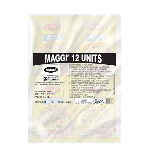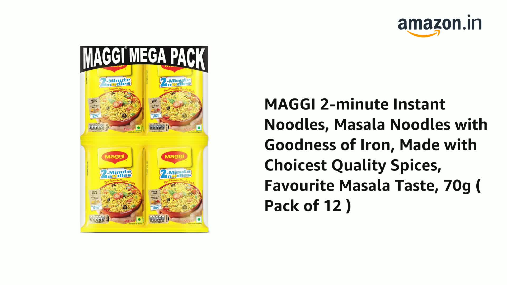 India's largest and most loved Noodles brand MAGGI 2-minute Noodles now comes with the goodness of Iron. Each portion (70g) of MAGGI Masala Noodles provides you with 15% of your daily Iron requirement (*as per the Daily Dietary Allowances for an Adult Sedentary Male (ICMR 2010)). Containing your favourite masala taste MAGGI noodles are made with the finest quality spices and ingredients that are manufactured in world class Noodles Technology for the best Noodles experience. Make your bowl of MAGGI even better by chopping up some vegetables dropping in an egg or throwing in your favorite ingredients. Usage Instructions: Prepare a delicious meal in just 2 minutes with MAGGI Boil 1½ cup of water and add the TASTEMAKER along with the noodle cake broken into 4. Cook for 2 minutes in open pan while you stir occasionally. Do not drain the remaining water. Store any remaining MAGGI noodles in an airtight container to retain freshness. Serving Instructions: Garnish with your favourite veggies and serve hot. Allergen: It may contain milk solids mustard and soya.