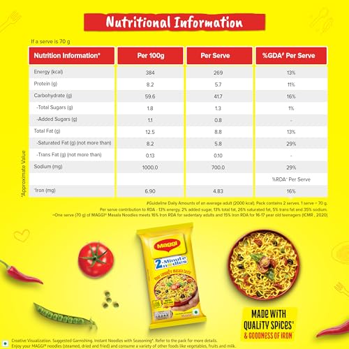 • GOODNESS OF IRON: Each serving (70 g) of MAGGI Masala Noodles provides 15% of the daily iron requirement