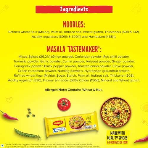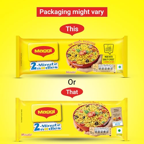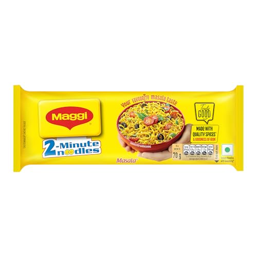 MAGGI 2-Minute Instant Masala Noodles is a favorite among people of all ages. MAGGI Masala instant noodles now come with the goodness of iron. Each portion (70g) of MAGGI masala noodles provides you with 15% of your daily iron requirement. It is just the perfect choice for those who need a quick and satisfying meal. MAGGI instant noodles are made with the choicest quality spices and ingredients to provide a great taste and experience. Usage instructions: Prepare a delicious meal in just 2 minutes with MAGGI â boil 1 cup of water and add the tastemaker along with the noodle cake broken into 4 pieces. Cook for 2 minutes in an open pan while you stir occasionally. Do not drain the remaining water. Garnish with your favorite veggies and serve hot. Storage instructions: Store in a cool dry and hygienic place to protect from insects pests and strong odors.