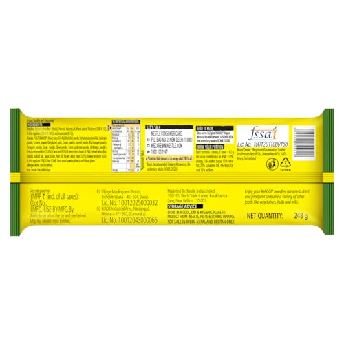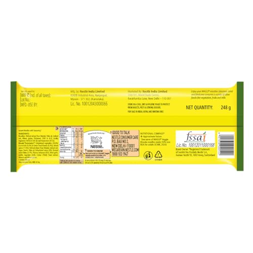 Maggi introduces the new Veggie Masala noodles which will turn your hunger into happiness. Enjoy the same great taste of Maggi with exciting and colourful veggies like carrots & beans. Experience the joy of cooking with Maggi Veggie instant noodles as it is easy to cook and already contains colourful veggies. Give your kids a perfect solution to their hunger with oh-so-yummy Maggi Veggie noodles. Usage : 1. Break the Noodle cake into four parts. 2. Add Noodles and TASTEMAKER to 210 ml (approx. 1 cup) of boiling water. 3. Cook for 2 minutes in an open pan. Stir occasionally. Do not drain remaining water. Hold for 1 min after cooking. Serve Hot. Storage instructions : Store in cool dry & hygienic place.