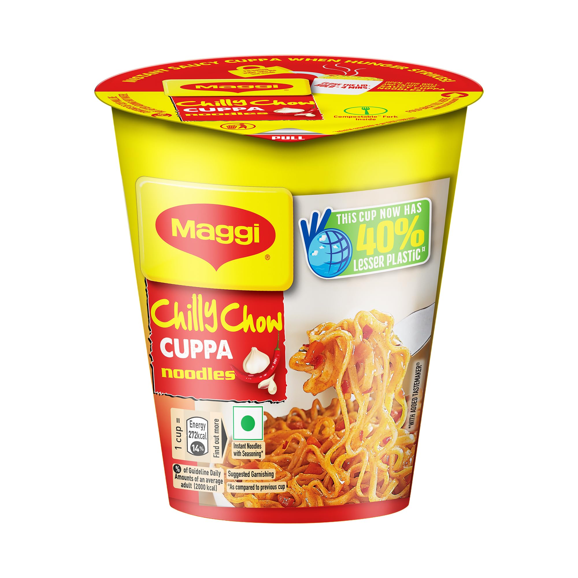 MAGGI Cuppa offers you the delicious taste of MAGGI combined with the convenience of cup noodles! It is an ideal offering for the new generation pressed hard for time trying to juggle multiple roles all at once & can be enjoyed anytime on the go. MAGGI cuppa noodles are made with the finest quality spices and ingredients. The cup comes with a tastemaker already added and a compostable fork inside for maximum convenience even on the go. Usage: When hunger strikes grab your MAGGI Chilli Chow Cuppa and add boiling water. In just 4 minutes get ready for a delicious saucy experience! Storage: Store in a cool dry and hygienic place to protect from insects pests and strong odours.