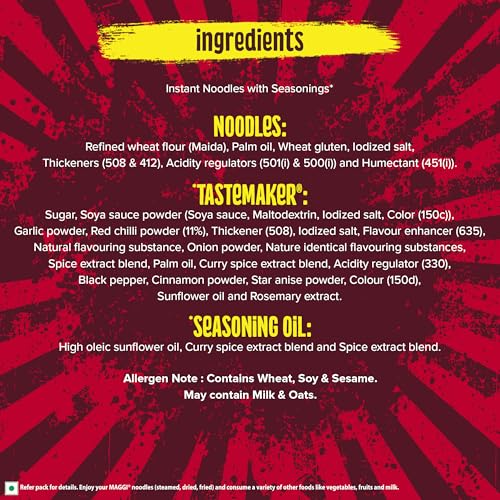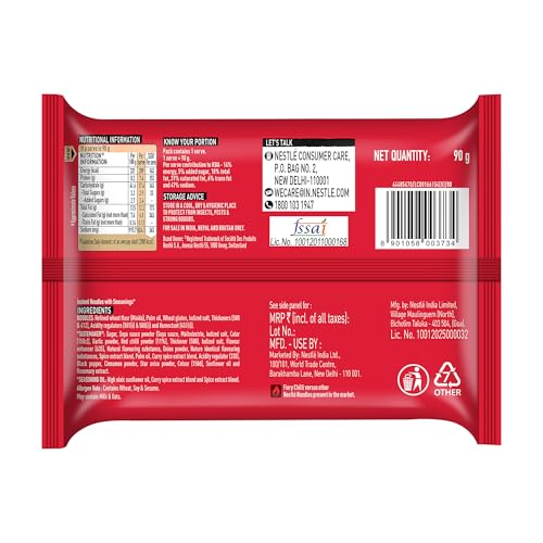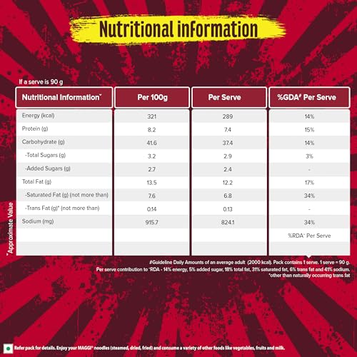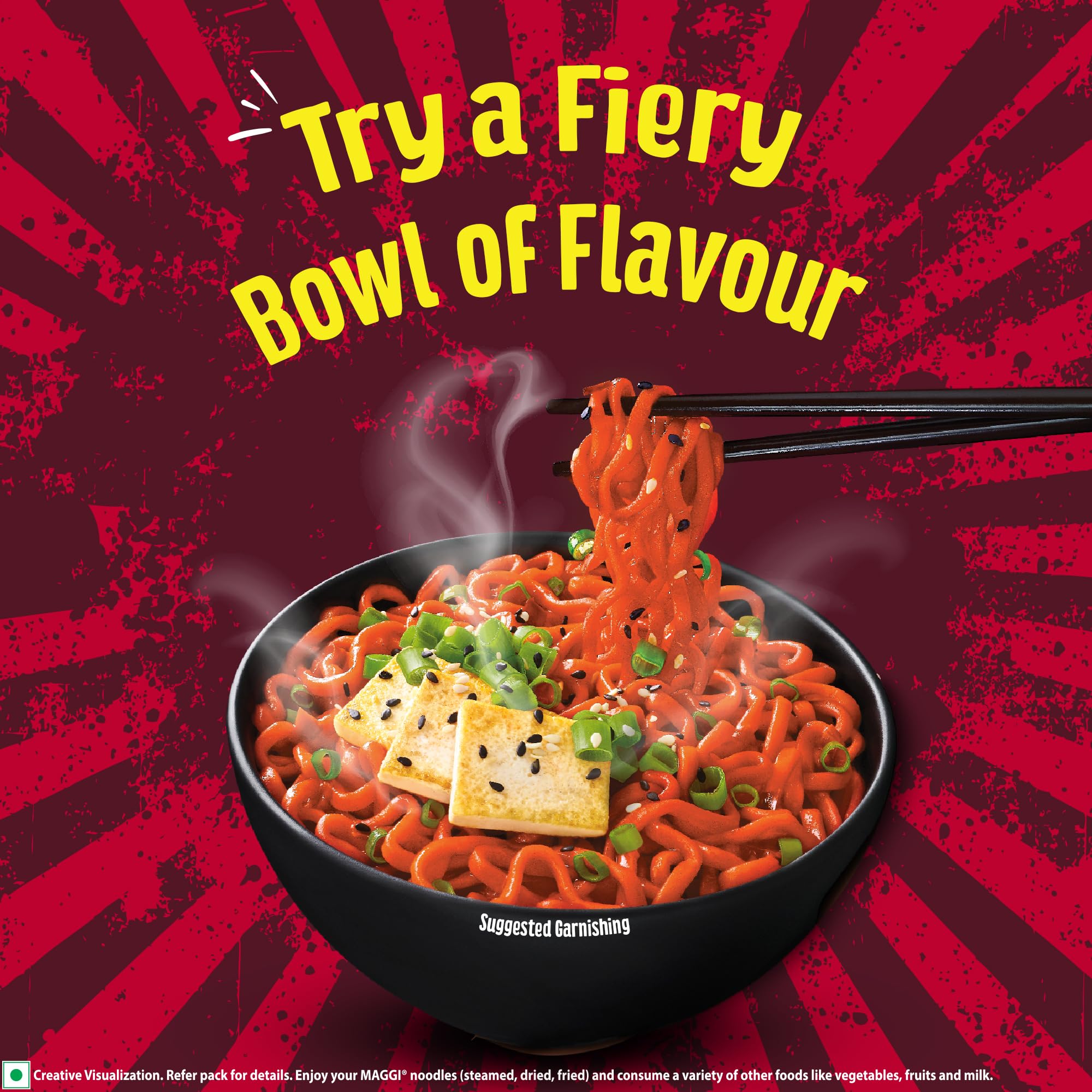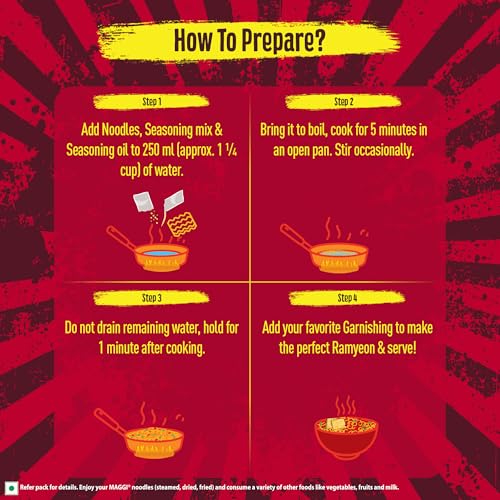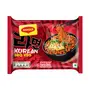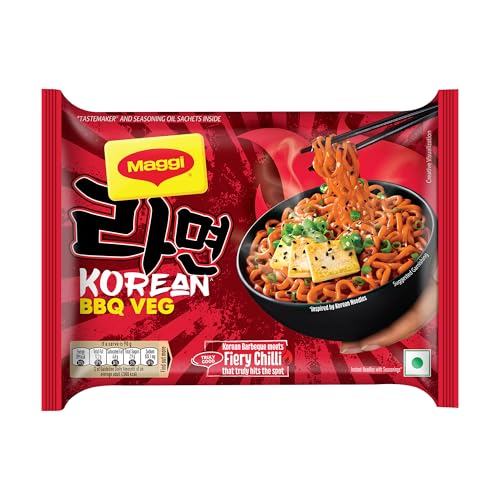 A fiery bowl of flavour that truly packs a punch! Big fan of spicy noodles and looking for something delicious for your taste buds? Well look no further! India' favourite brand MAGGI is finally here with the long-awaited Korean noodles! Indulge in a spicy affair with this instant noodles where Korean barbeque meets fiery chilli that truly hits the spot! MAGGI Korean BBQ veg noodles offer an irresistible fusion of world-famous Korean flavours and the classic MAGGI twist. These instant noodles are perfect for your go-to snack when craving something hot delicious and quick. So grab your chopsticks and enjoy this fiery bowl of delicious ramyeon anytime! How to Cook: Add noodles to 400 ml (approx. 2 cups) of boiling water and cook for 3 mins in an open pan. Drain out the water. Add seasoning mix and seasoning oil. Mix well. Add your favorite toppings to make the perfect Ramyeon & serve! Storage Instructions: Store in a cool dry hygienic place to protect from insects pests & strong odours.