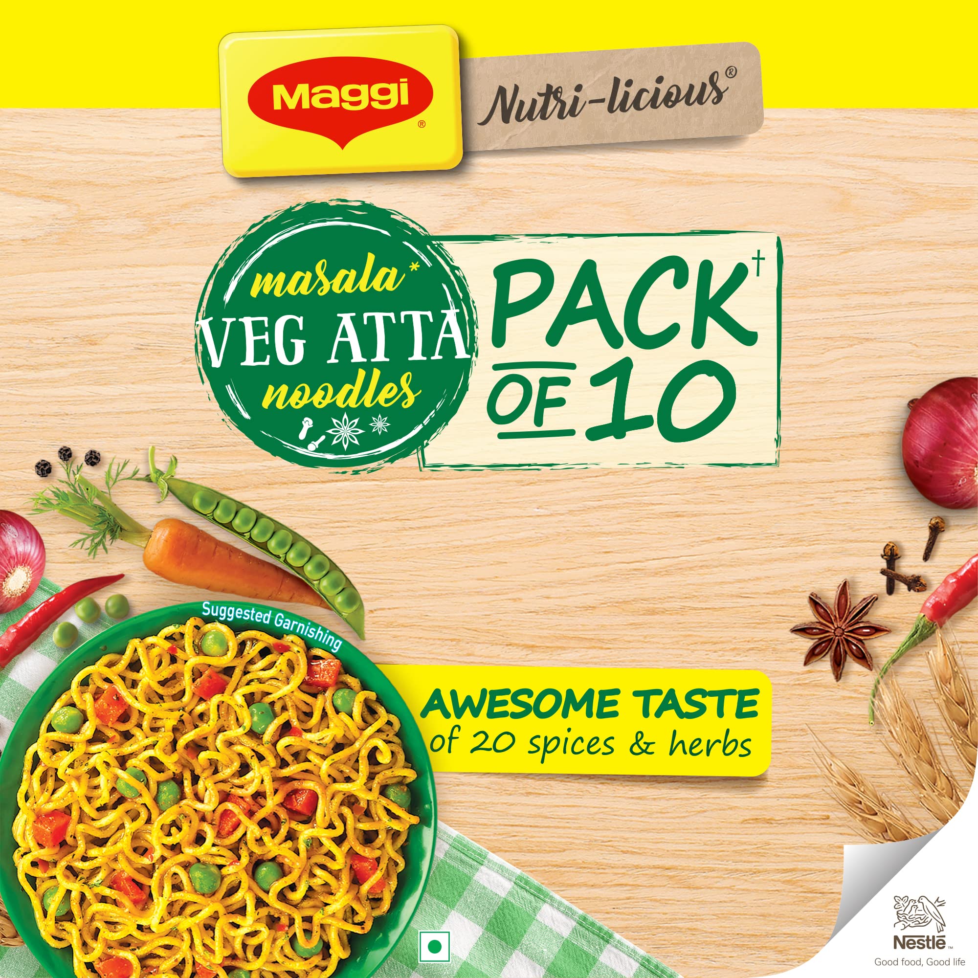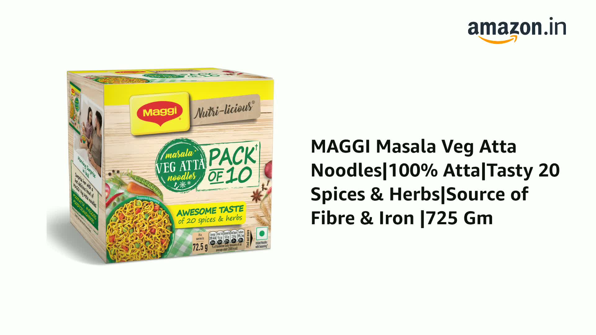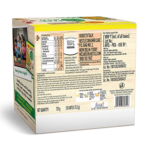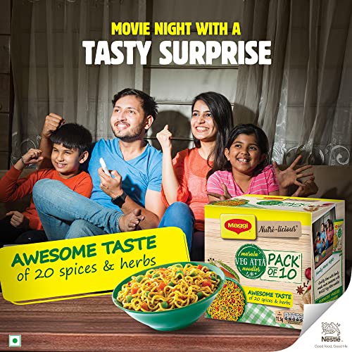 Introducing the Maggi Nutri-licious Masala Veg Atta Noodles with appetizing aroma and delicious masala taste made using 20 spices & herbs. These masalas are roasted to perfection for an aroma & flavour which you will love. These Maggi Nutri-licious Masala Veg Atta Noodles are truly a good combination of delicious and nutritious wheat flour (Atta) colourful vegetables & the awesome taste of 20 spices & herbs. Enjoy a perfect snacking experience and make family time more awesome with this pack of 10 Maggi Nutri-licious Atta Masala Noodles. Each serving (72.5g) of the Maggi Masala Veg Atta Noodles is a Source of Fibre & Iron (Refer pack for more details). USAGE INSTRUCTIONS: Making Maggi Nutri-licious Masala Veg Atta Noodles is as easy as it could ever be - Break the Atta Noodle cake into four parts. Add noodles and Masala Tastemaker to 225 ml (1 ½ tea cups) of boiling water. Cook for 3 minutes in an open pan. Stir occasionally. Do not drain the remaining water. Hold for 1 minute. Serve hot. STORAGE INSTRUCTIONS: Store in a cool dry & hygienic place to protect from insects pests & strong odours. Allergen information: May contain Milk and Soya