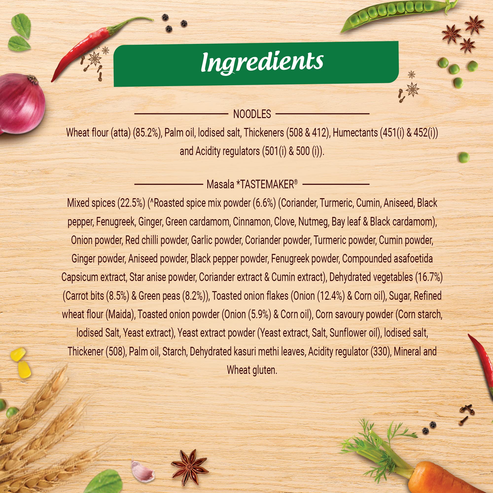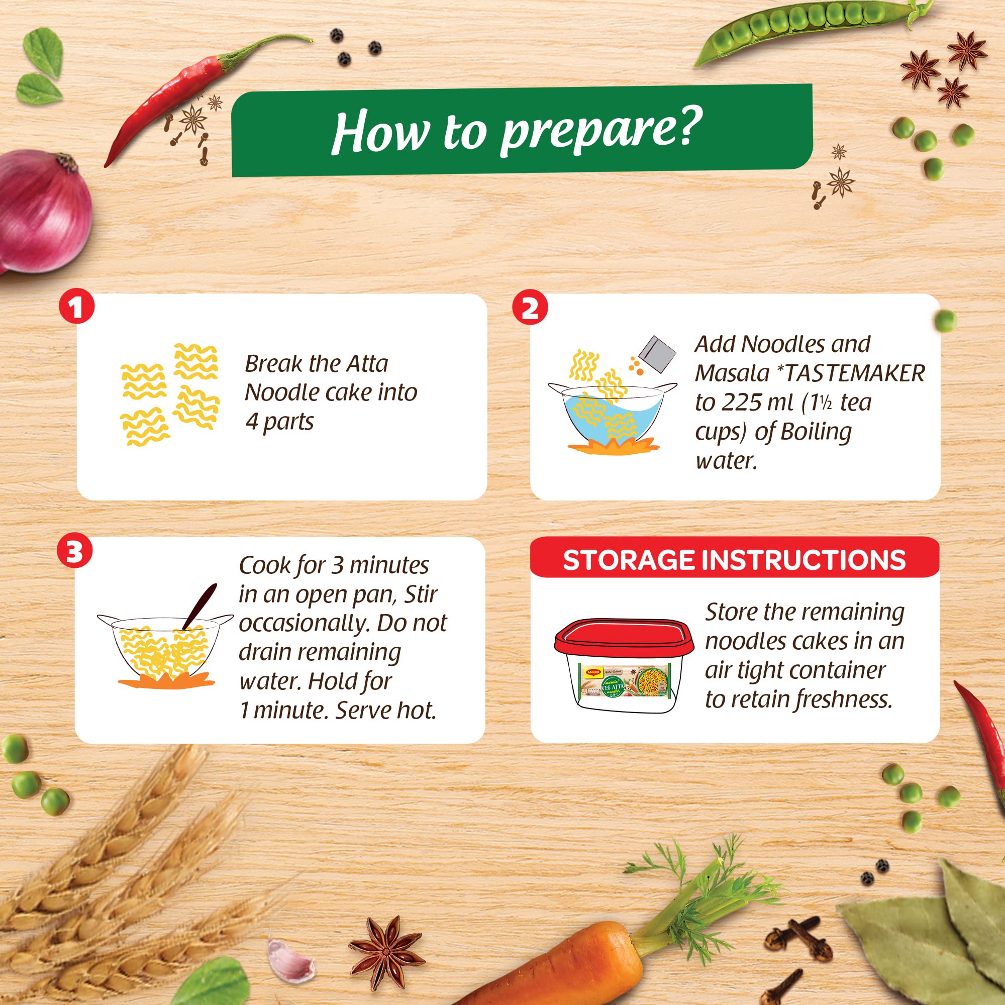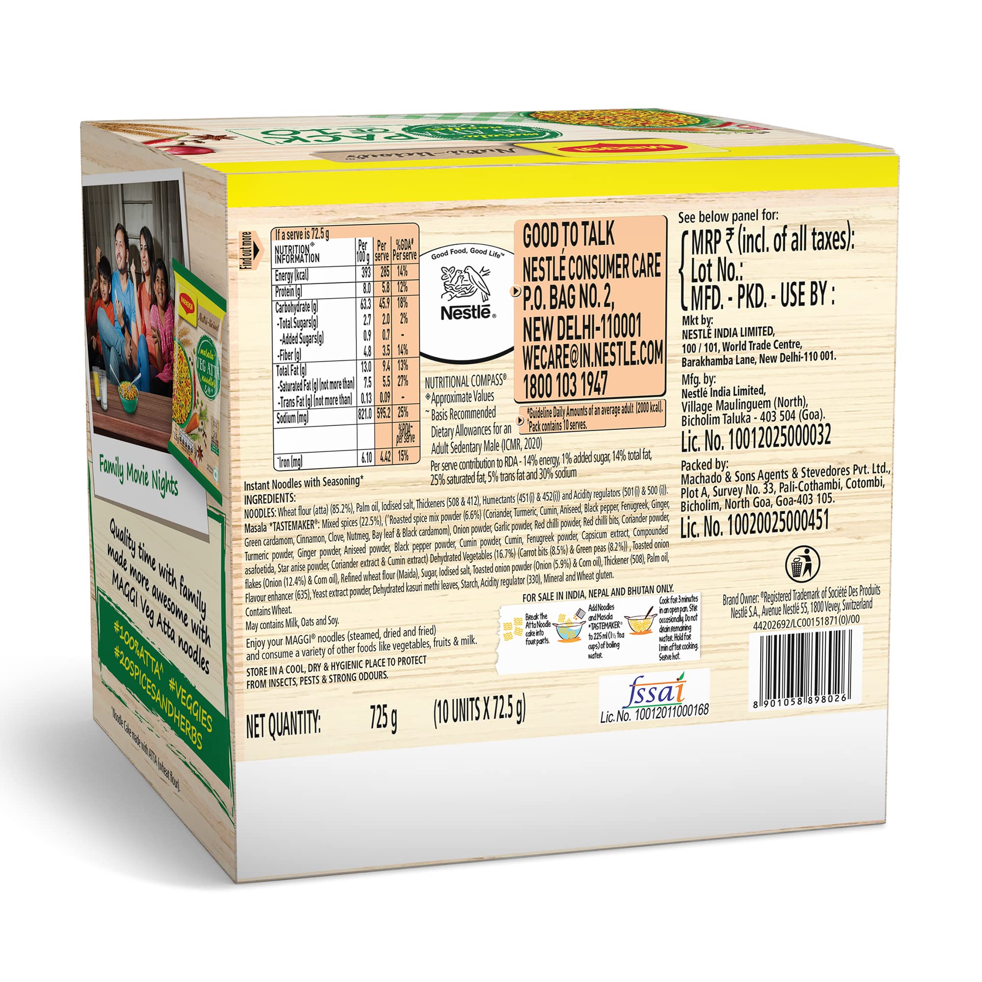 Introducing the Maggi Nutri-licious Masala Veg Atta Noodles with appetizing aroma and delicious masala taste made using 20 spices & herbs. These masalas are roasted to perfection for an aroma & flavour which you will love. These Maggi Nutri-licious Masala Veg Atta Noodles are truly a good combination of delicious and nutritious wheat flour (Atta) colourful vegetables & the awesome taste of 20 spices & herbs. Enjoy a perfect snacking experience and make family time more awesome with this pack of 10 Maggi Nutri-licious Atta Masala Noodles. Each serving (72.5g) of the Maggi Masala Veg Atta Noodles is a Source of Fibre & Iron (Refer pack for more details). USAGE INSTRUCTIONS: Making Maggi Nutri-licious Masala Veg Atta Noodles is as easy as it could ever be - Break the Atta Noodle cake into four parts. Add noodles and Masala Tastemaker to 225 ml (1 ½ tea cups) of boiling water. Cook for 3 minutes in an open pan. Stir occasionally. Do not drain the remaining water. Hold for 1 minute. Serve hot. STORAGE INSTRUCTIONS: Store in a cool dry & hygienic place to protect from insects pests & strong odours. Allergen information: May contain Milk and Soya