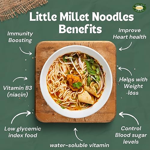 Pasta and noodles are a fave. Comforting easy-to-cook and delicious. But if you are concerned about maida and other harmful content then MilletAmma got your back! MilletAmma has come up with Little Millet instant noodles. Little Millet one of the small millets commonly called kutki in Hindi millet is of low glycemic index food that contains slow-digesting carbs and dietary fiber that takes a long time for to enter the stream and help control levels. It is rich in magnesium which helps improve health. Vitamin B3 (niacin) a water-soluble vitamin helps lower . It also contains phosphorus which helps with body tissue repair after strenuous workouts and energy production. With our Multi Millet Noodles that's exactly what you can do. These noodles are made of five different kinds of millet â Ragi (Finger Millet) Varagu (Kodo Millet) Samai (Little Millet) Kuthiravally (Barnyard Millet) and Kambu or Bajra (Pearl Millet). It gives a healthy taste to the usual hakka noodles by being protein rich high in fibre and calcium. Together this combination of millet contains a good amount of protein calcium dietary fiber and several essential miner. provide you with the goodness of grains such as quinoa red rice buckwheat millets etc which are rich in essential nutrients like iron vitamin B phosphorus Magnesium and fiber. Wholegrains like quinoa are a good source of anti. Red rice has 10 times more antithan brown rice. The antioxidant called Anthocyanin is the pigment which gives red rice its reddish-purple color. These are powerful anti-agents and also help to promote skin and eye health. Quinoa red lentil and chickpeas are known to be among the highest sources of plant based proteins thus making noodles and pastas made with such ingredients highly nutrient rich.