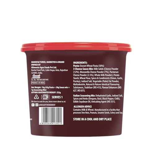 MOM - Meal of the Moment, 3 Cheese Pasta, 65/ 74g (Pack of 3) - Ready to eat | No added Preservatives | Instant Meals | 100% durum wheat