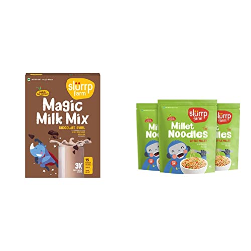 Slurrp Farm High Protein Chocolate Swirl Milk Mix | No Maida No Sugar | Contains Goodness of Millets- Made with Ragi and Jowar | 250gIntroducing Slurrp Farm No Sugar Chocolate Swirl Milk Mix high in protein and made with all natural ingredients. This perfect companion to milk has no added sugar no wheat no preservatives and no chemicals. It is mildly sweetened with jaggery and made with supergrain millets like ragi oats and jowar. The healthy milk mix is rich in protein calcium iron and other essential nutrients necessary for the growth of your child without any added artificial flavors or colors.Slurrp Farm No Maida Millet Noodles | Not Fried No MSG | Little Millet Noodles Pack of 3- 192g EachNo maida refined sugar and palm oil not fried