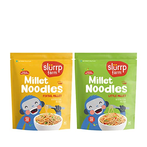 Slurrp Farm Instant Moong Dal Khichdi for Little Ones | No Sugar | No Salt | No Milk | Healthy Cereals for Kids with Real Vegetables | Great for Travel | Easy to digest 200gIngredients: Jowar(Sorghum) Moong Dal Oats Tomato Powder Carrot Powder Turmeric Powder Cumin Powder Coriander Powder Vitamins and Minerals | How to Use: 1. Add 1/2 cup of water into a pan 2. Add 3 level table spoons (30 gms) of Moong Dal Khichdi 3. Mix well to remove the lumps 4. Cook on a medium flame for 3-5 mins and stir continuously to avoid lumps 5. Cool to room temperature and feed immediately | Once the pack is opened transfer the contents to an airtight container store in cool dry place or in a refrigerator | At Slurrp Farm brand made by 2 Mothers we are passionate about raising awareness of healthy eating for children and giving busy parents like us the convenience needed in terms of being able to find food options which are as good as what we would make at home.Slurrp Farm No Maida Millet Noodles | Not Fried No MSG | Foxtail Millet and Little Millet Noodles Combo | Pack of 2-192g EachNo maida refined sugar and palm oil not fried