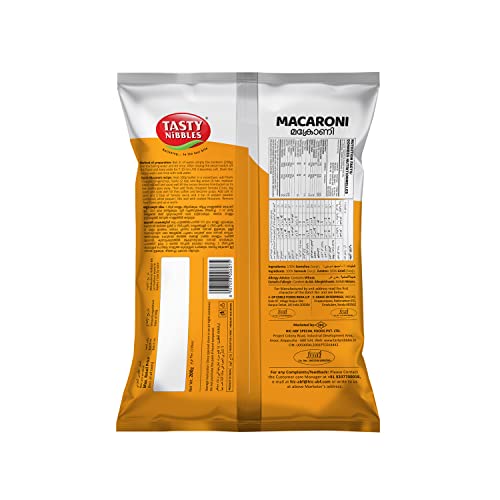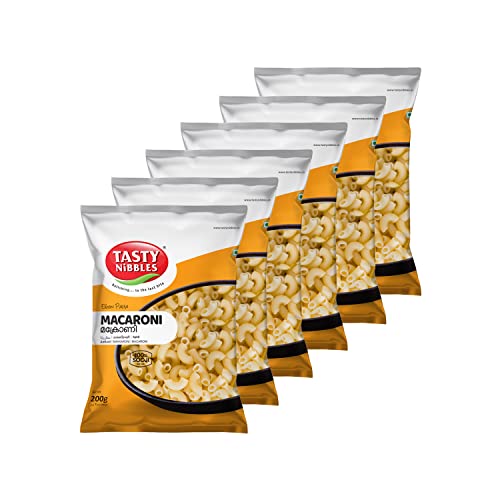 Tasty Nibbles elbow macaroni is made from 100% Semolina suitable to prepare very delicious pasta. No added preservatives or additives. Ingredient : 100 % Semolina Available quantity: 200g Method of preparation: Boil 2L of water empty the contents (200g ) into the boiling water and stir once. After closing the vessel switch off the flame and keep aside for 7-10 min /till it becomes soft. Drain the excess water and rinse with cold water. Quick Macaroni recipe: Heat 100g butter in a vessel/pan add finely chopped Ginger(2tsp) Garlic(2 tsp) and Big onion(4 nos.medium sized) mix well and sauté well till the onions become translucent or its raw aroma goes away. Then add finely chopped Tomato (1nos big sized)and cook well till they soften and become pulpy. Add salt to taste and 2 tbsp of Tomato sauce and 2 tsp of pepper powder (preferably white pepper) .Mix well with cooked Macaroni. Remove from flame and serve warm.