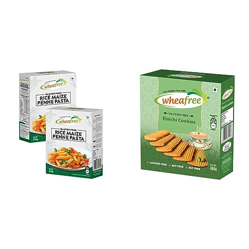 Wheafree Gluten Free Rice Maize Penne Pasta - 2 Packs (250g Each) | No Trans Fat | No Cholesterol | Easy to CookWheafree Gluten Free Rice Maize Penne Pasta - 2 Packs (250g each) With Wheafree Rice Maize Penne Pasta you can cook traditional pasta delicacies at home. Get creative in the kitchen with these easy-to-cook gluten free Rice Maize Penne Pasta. You can pair them well with a variety of sauces and vegetables. It is an ideal meal for those who are celiac gluten intolerant vegan and vegetarian families. Simply cook and savour the delicious goodness of Wheafree Rice Maize Penne Pasta How to make 1. Boil the water in a wide mounted container and take ½ litre of water for every 50 grams of dry pasta. 2. To the boiling water add dry pasta ¼ teaspoon salt and ½ tablespoon of oil. Stir the pasta periodically and let it cook for 8- 10 minutes. Take a piece to ensure it has no dry center. 3. Drain the water & rinse in cold water. Smear the drained pasta with 1/2 teaspoon of oil. 4. In a separate pan heat some oil and sauté your choice of vegetables and prepare pasta sauce. 5. Then add the already boiled pasta and stir with light hands. Cooks it for a few minutes only.Wheafree Gluten Free Elaichi Cookie 400g Pack | Lactose Free | No Maida | Best Tea Time Snacks | 100% Vegetarian and Wholesome IngredientsWheafree Elaichi Cookies are a favourite tea time snack which is baked to crunchy perfection. Our gluten free cookies are crispy in texture and have a delicately balanced flavour. They go perfectly well with your hot tea coffee and you can also snack them while travelling. Now they are lactose free also.