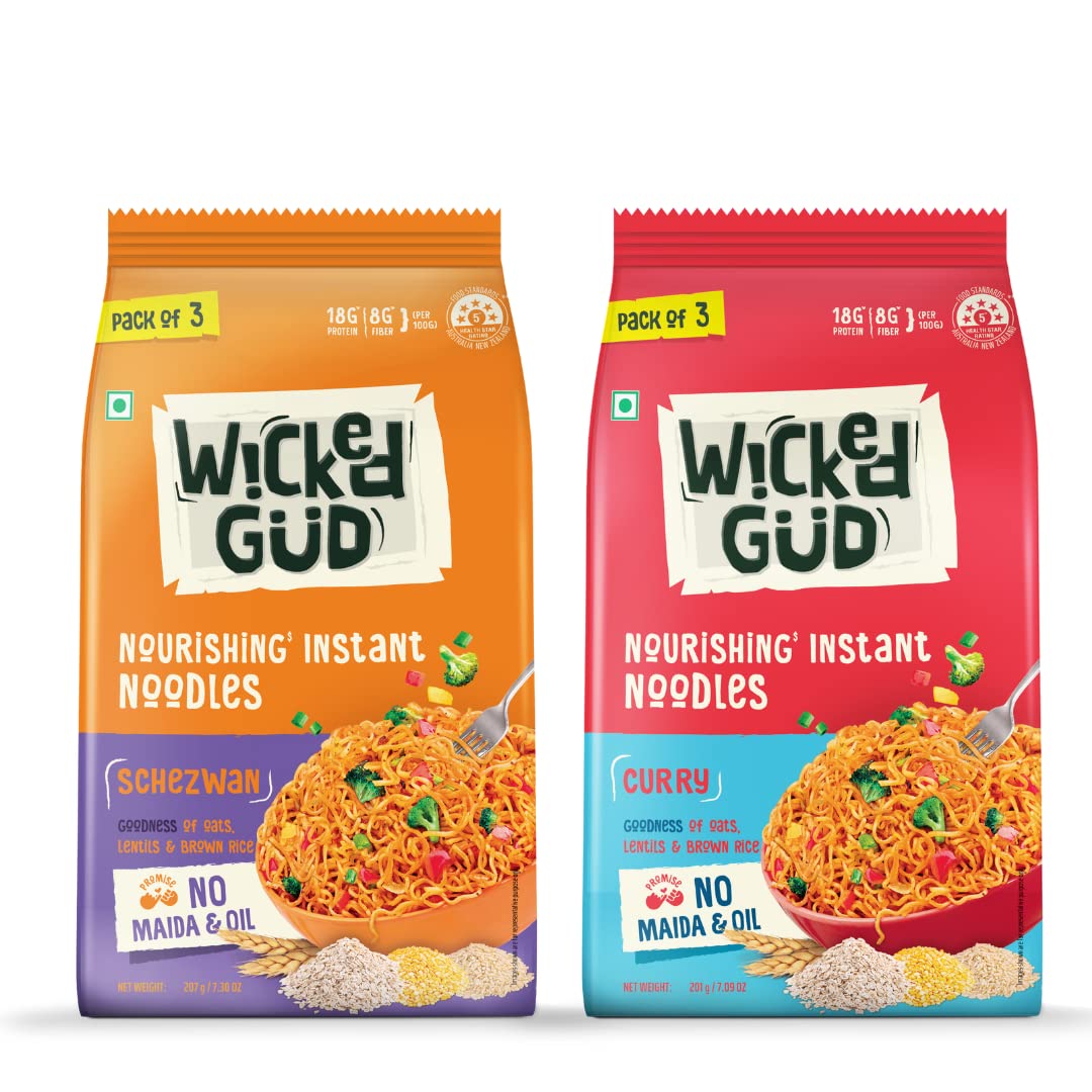 WickedGud Schezwan Noodles (207gm) & Curry Noodles (201gm) | Healthy Noodles | No Maida | No Oil | No MSG | High Protein | High Fibre | Cholesterol Free
