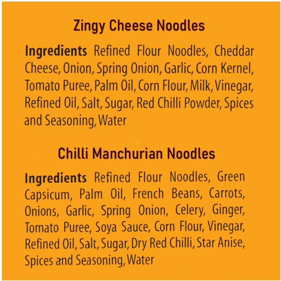 The yummy Zingy Cheese noodles contain cheddar cheese spring oninios and corn kernels making them absolutely delictable.