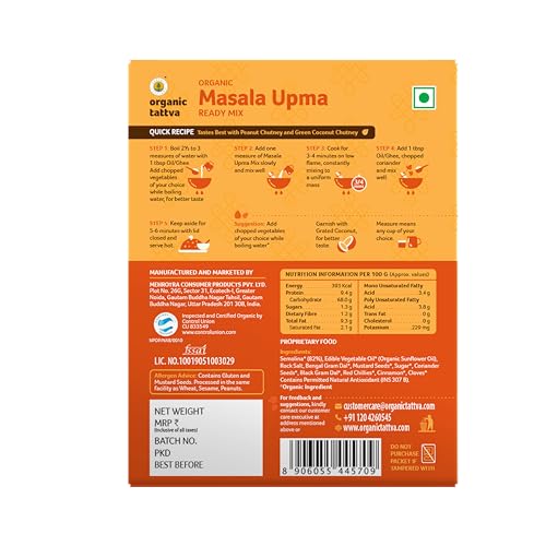 Organic Tattva Organic Upma Ready Mix is an Instant Upma breakfast blend ready with organic wholegrains and sweet-smelling flavors which gives this flavourful UPMA a fascinating turn with a heavenly explosion of your number one flavors and veggies. Mixed with crunchy pulses and fragrant flavors of spices each nibble of this awesome UPMA will make you a stride nearer to home. Organic Tattva Instant suppers range guarantees a solid and a credible taste that takes you home. Advantageous and simple to-make these prepared to-have moment breakfast meals can be made in only a couple of moments. Have consecutive gatherings and don't have the opportunity to set up a breakfast/meal? No concerns. Get a pack of Organic Tattva Instant Ready Mix Upma add heated water mix and your moment feast will be prepared in only 5 minutes! Enjoy your favourite food with prepared to eat upma by Organic Tattva which has organic wholegrains rock salt seasoning of mustard cumin and natural sunflower oil that will remind you the taste and decency of your mom's kitchen.