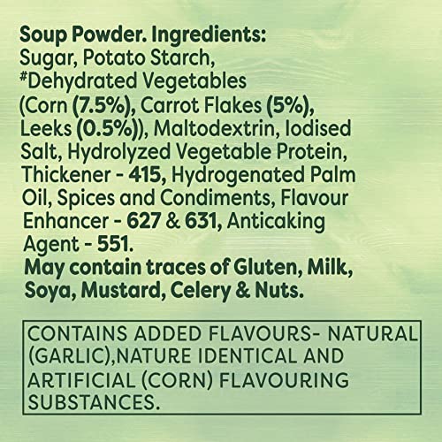 Sugar Potato Starch Tehydrated Vegetables (Corn (7.5%) Carrot Flakes (5%) Leeks (0.5%)) Maltodextrin Iodised Salt Hydrolyzed Vegetable Protein Thickener - 415 Hydrogenated Palm Oil Spices and Condiments Flavour Enhancer - 627 & 631 Anticaking Agent - 551.