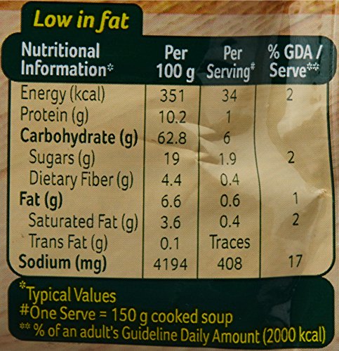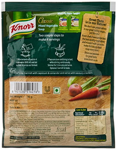 A medley of vegetables offer a unique taste to Knorr Mixed Vegetable Soup. This easy to make concoction is a savior when you are hard pressed for time and it helps save your time and energy without compromising on the taste. The soup is as nutritious as it is tasty with its fresh ingredients. You can whip up this soup in a jiffy and serve to your family and friends. It is filling and wholesome. You can serve it as an accompaniment or as a main dish the choice is yours. It's fresh and natural flavor is further enhanced by traces of nuts and soya added to the soup mix. Pick this pack now!