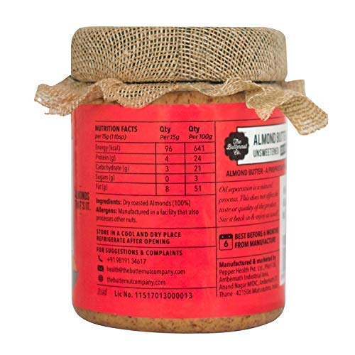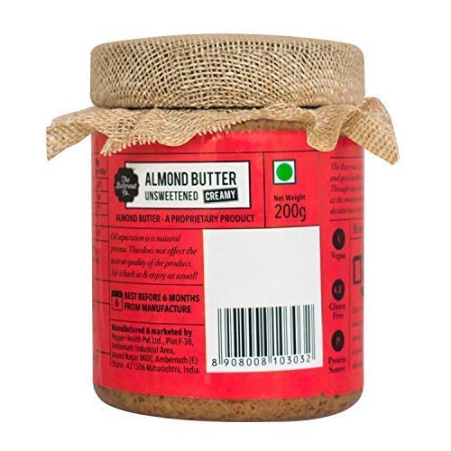 Some heroes can pull it off without a sidekick. The Bare Almond is no different. With nothing but Almond goodness (which makes it less sweet) there is only protein richness that you can expect. Apart from which its smooth and gooey texture just melts in your mouth as you scoop it till the very end with your fingers. Bare it all with this almond we say. Meet our one ingredient pure nut butter with no added anything. Nutrition packed almonds ground to perfection creating a dreamy 100% purely natural nut spread. Oil sugar and preservative free. Nuts are high in protein fiber and many essential vitamins and minerals. Add it to a smoothie for breakfast have it with a banana or enjoy on toast for the perfect snack.Pure Dry Roasted Almond Spread.Shelf life- 270 days from the date of manufacturingIngredients: Dry Roasted AlmondsHow to Eat: A universal genius add it to breakfast milkshakes cupcakes and just about anything else.Dig | Lick | Repeat