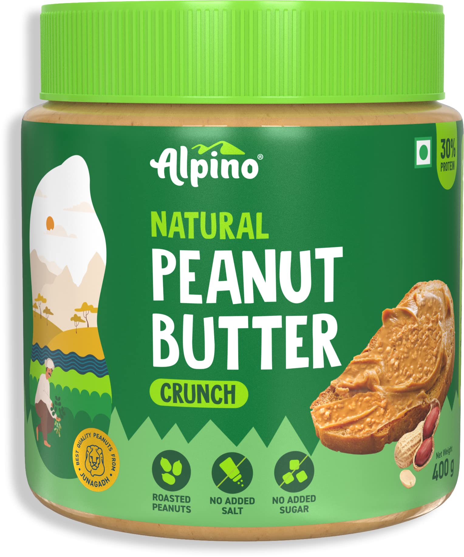 ALPINO Natural Peanut Butter Crunch 400g - 100% Roasted Peanuts - 30g Protein, No Added Sugar & Salt, Gluten Free Plant Based, Unsweetened Peanut Butter Crunchy - as Seen on Shark Tank India