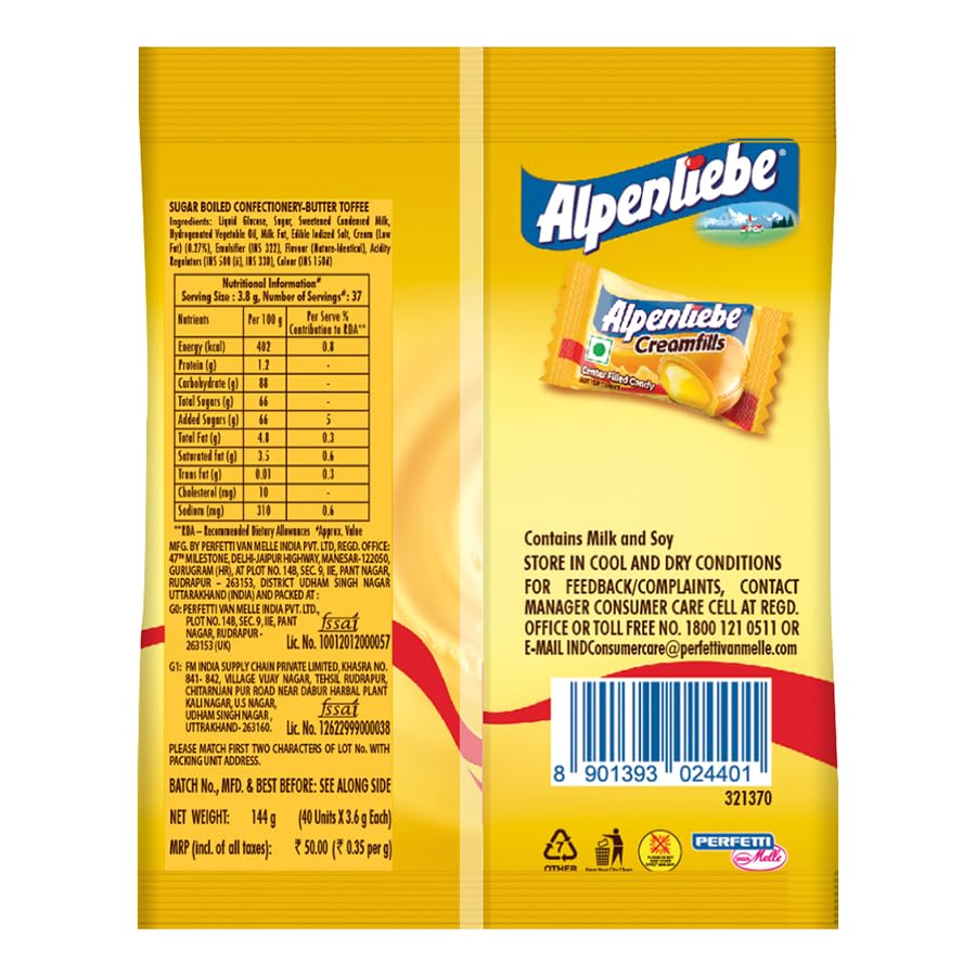 The milky taste provides a lingering rich experience. Caramel toffee with a tinge of butter at its core Alpenliebe Creamfills is a fun-filled candy to have at any time of the day and enjoy with friends and family. The rich and creamy taste makes it a favourite among kids grown-ups alike.