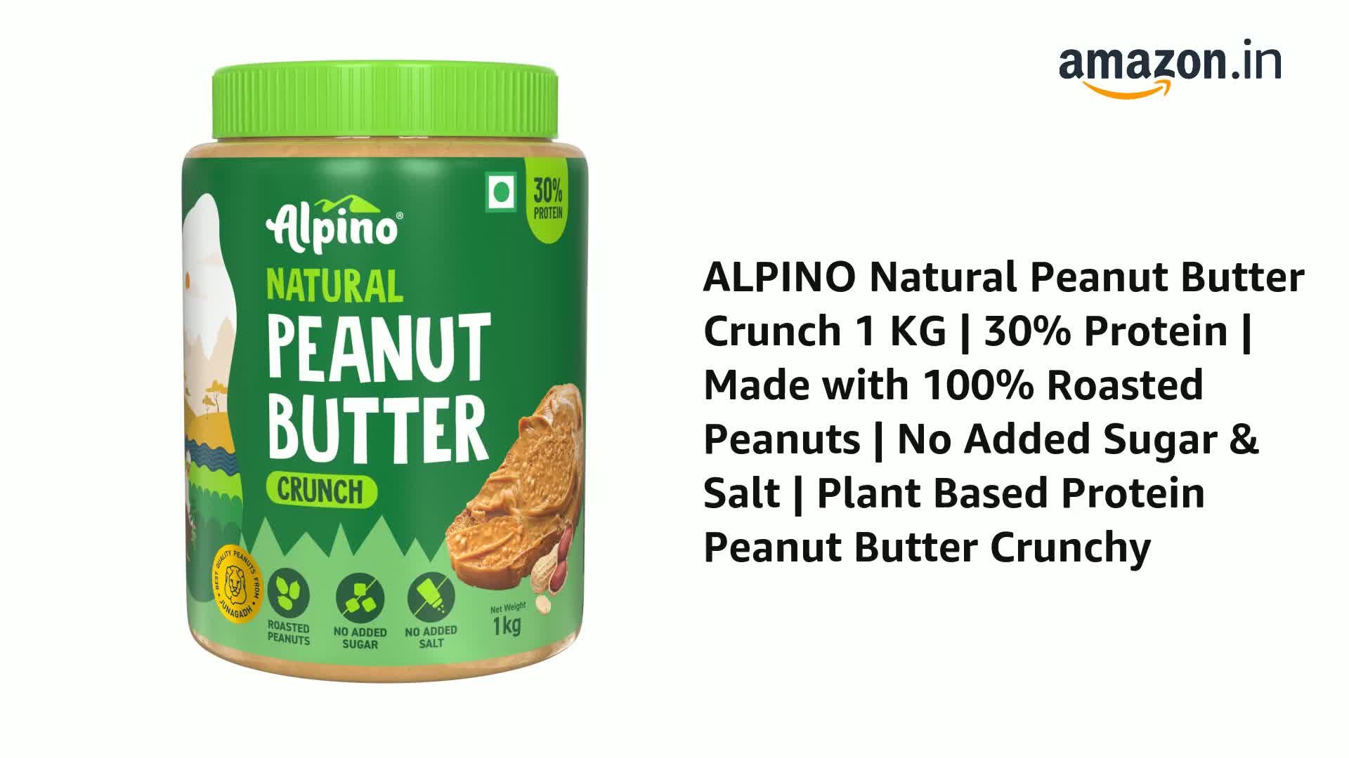 Alpino Natural Peanut Butter Crunch 1 KG | Unsweetened | 30% High Protein| Made with 100% Roasted Peanuts | No Added Sugar or Salt | No Hydrogenated Oils | Non GMO | Gluten Free | Vegan