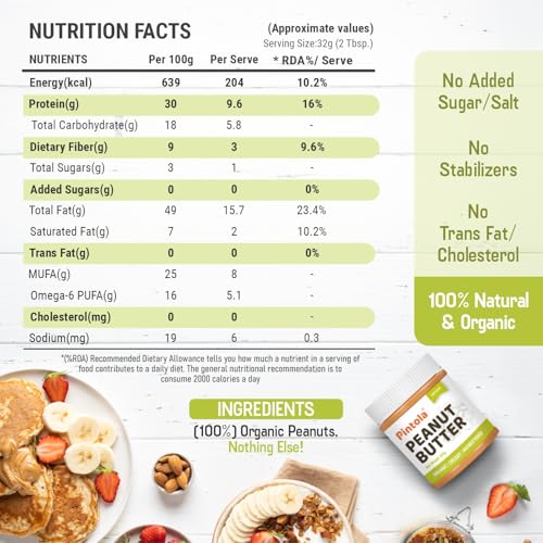 Pintola Organic Unsweetened Peanut Butter Creamy 350g - Protein 30g & 9g Dietary Fiber, Made with Organic Peanuts, No Added Sugar, No Preservatives