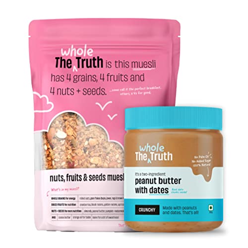 The Whole Truth Breakfast Combo. Best and the most healthy breakfast option. Freshest Saurashtra peanuts slow roasted & smoothly ground to perfection sweetened with real whole dates ( you'll see the chunks inside). No added sugar or honey or any sugar substitute. Just two ingredients. Just too good.