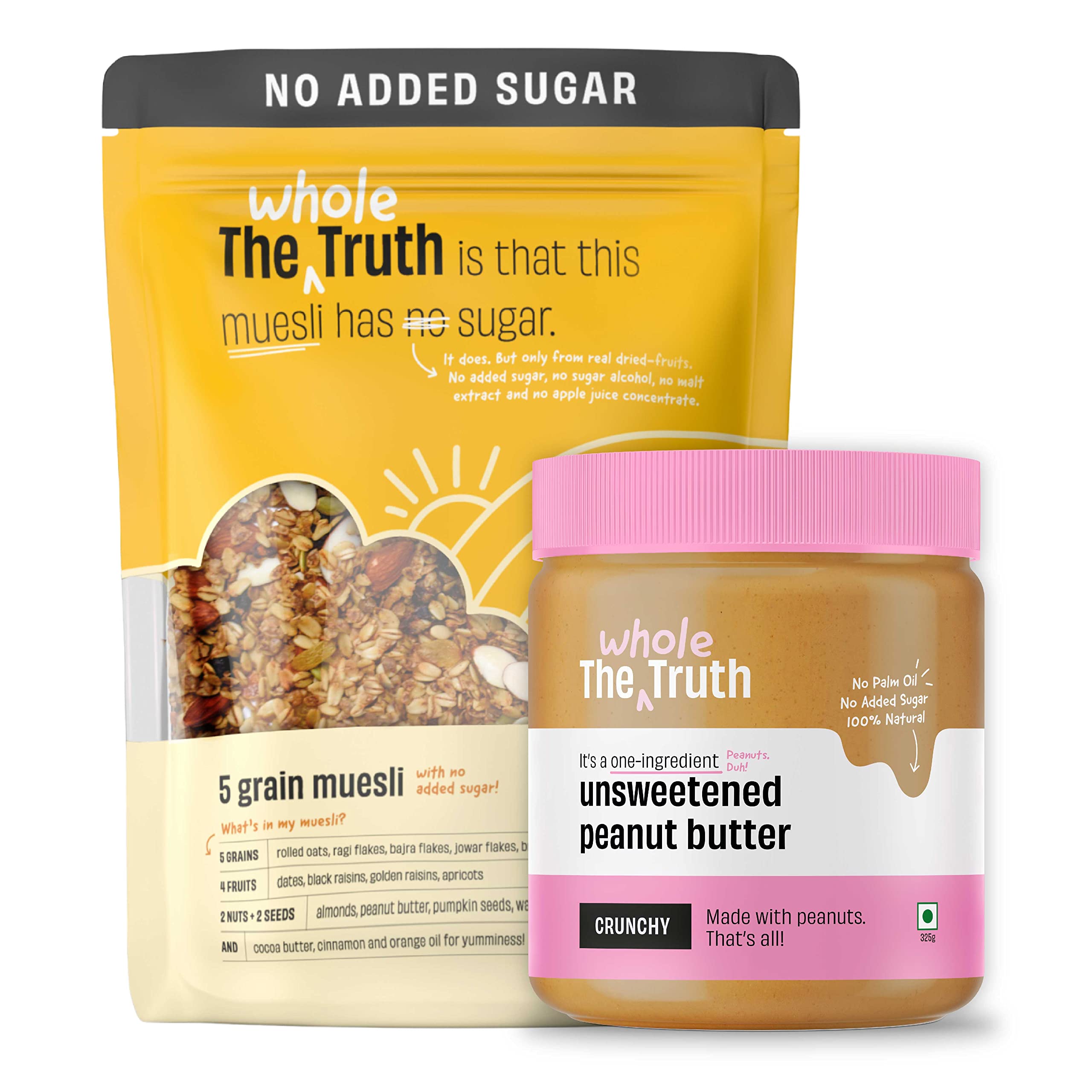The Whole Truth - Breakfast Combo - Unsweetened Peanut Butter Crunchy (325g) + No Added Sugar Muesli (350g) | Pack of 2 - No Added Sugar | No Preservatives |