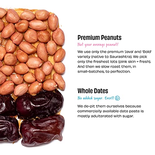 • Freshest Saurashtra peanuts slow roasted & smoothly ground to perfection sweetened with real whole dates ( youall see the chunks inside). No added sugar or honey or any sugar substitute. Just two ingredients. Just too good. PS: Extraaaa crunchyyy!