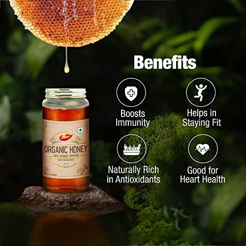 Organic is not just a one-time choice ; It's a way of life. Are you also always in search of organic goodness for your family? Are you looking for 100% Pure and Natural honey straight from the hive? Then here we Present to you Dabur Organic Honey which is NPOP organic certified honey from the house of Dabur Honey World's No 1 Honey brand. This thick delicious honey is sourced from the hives of Apis Dorsata honeybees nestled in deep forests. No chemicals or pesticides are used within a 5 km vicinity of these hives thereby ensuring that honeybees collect nectar only from organically grown wildflowers. It is raw unprocessed and unpasteurized honey which is naturally rich in antioxidants to help boost immunity. It is a good source of nutrition and is considered useful in cough and cold. It offers multiple health benefits like improved stamina better digestion good for heart health & in maintaining a healthy lifestyle. Dabur Organic Honey is 100% compliant with all testing parameters mandated by FSSAI for purity guarantee .Kickstart your day with Dabur Organic Honey and make a healthy choice. Buy now.