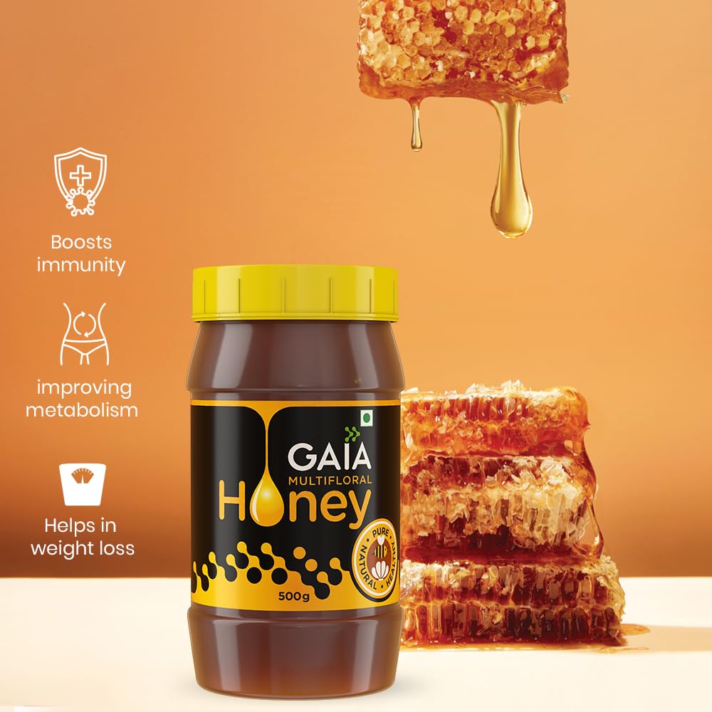 HomeGroceryFlavorsRaw HoneyGAIA Multi Floral Honey - 100% Pure & Natural Honey | No Preservative | No Artificial Color | No Sugar Added | Boosts Immunity | Used to Cure Cold or Cough | Anti-oxidants | Weight Loss 500 GM Bottle