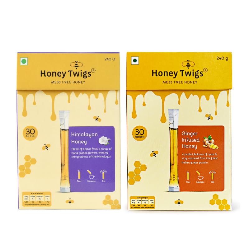 Honey Twigs Natural Honey | Himalayan Multi Floral Honey and Ginger Honey 480g(240g + 240g - 60 Twigs) | Infused with Natural Ingredients | Pure Honey | No Added Color | No Preservatives
