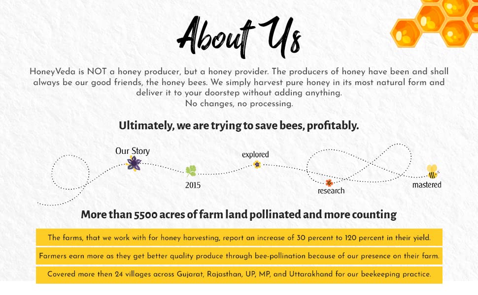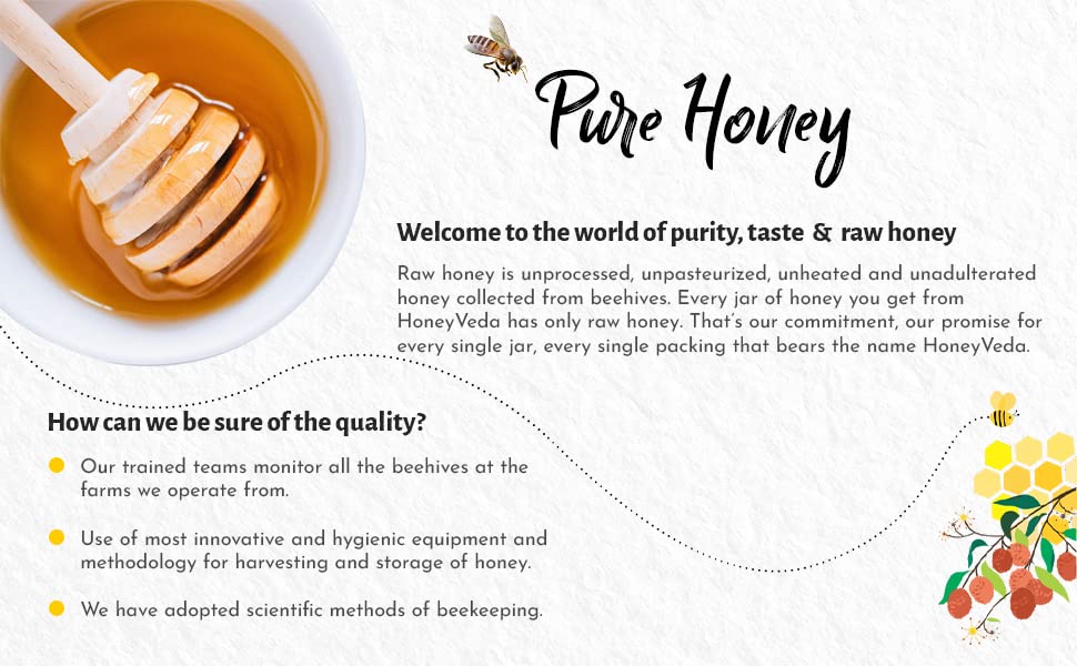 HoneyVeda is committed to bringing you raw natural honey. The monofloral honey you get from us is rich in natural antiminerand a whole lot of enzymes and vitamins. Thats because we are passionate about getting you the best quality honey. We work across farms in various Indian states including Gujarat Madhya Pradesh Uttar Pradesh Uttarakhand Jammu & Kashmir and so on. As a result we can bring you authentic and the best monofloral honey of a wide range. We make sure that every jar of honey you get from HoneyVeda is healthy tasty and nutritious. And for that we do a lot of things. We train our farm teams and keep them updated about farm management and beekeeg best practices. Our teams fully understand the importance of every stage of beekeeg honey harvesting and packaging. We follow rigorous hygiene standards when it comes to supplying 100% natural honey to our valuable customers. We love it when you can enjoy the benefits of pure unprocessed honey with all its vitamins and amino acids intact.