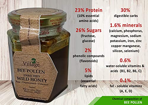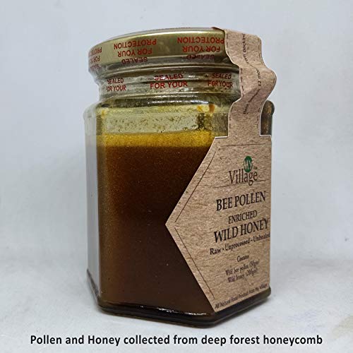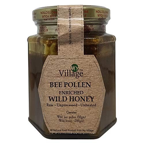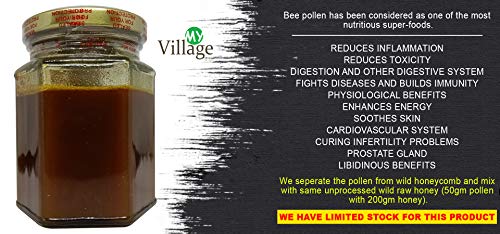 • A Natural protein-rich Super Food from My Village. It contains 50gm Bee Pollen (from deep forest honeycomb) and 200gm Raw-Unprocessed-Unheated wild bee honey.