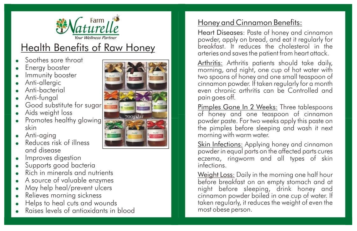 • Farm naturelle Raw honey contains all naturally occurring vitamins A, B-complex, C, D, E, & K, a whole lot of minerals, amino acids and hundreds of live enzymes to give you in-numerous health benefits which no other super-food can provide.