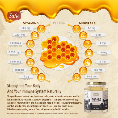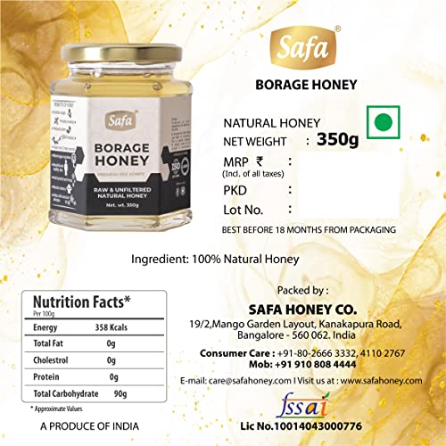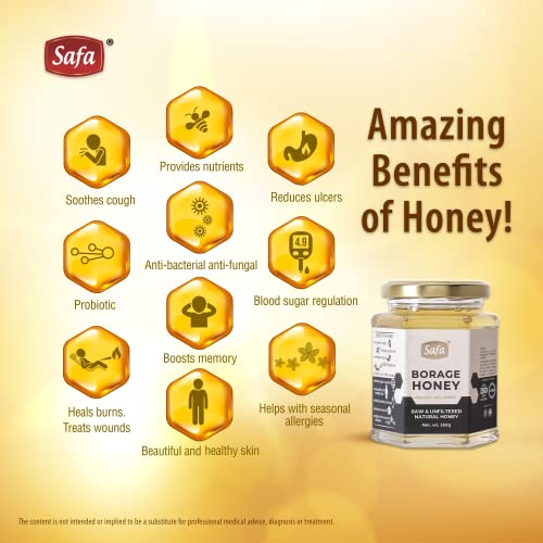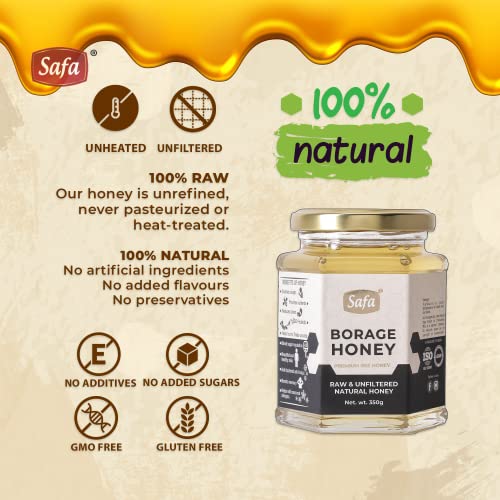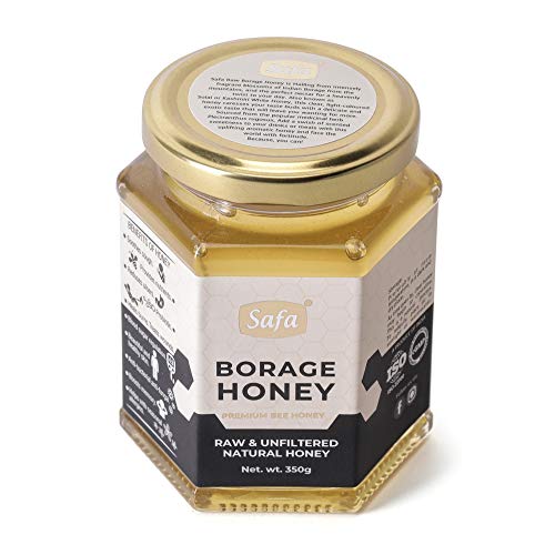 Hailing from the fragrant blossoms of Indian Borage from the mountains Safa Raw Borage Honey is the perfect nectar for a heavenly twist to your day. Also known as Solai or Kashmiri White Honey this clear light-coloured honey caresses your taste buds with a delicate and exotic taste that will leave you wanting for more. Benefits of Raw Borage Honey: Immunity Booster: Sourced from the popular medicinal herb Plectranthus rugosus Raw Borage Honey is a must-have in your cupboard for its healing and rejuvenating qualities. Raw Honey is a strong immunity booster which strengthens the body against cold flu respiratory infections asthma and improves wellness. Improves Stress and Mood: Raw Borage Honey with its delicate and pleasant fragrance and taste carries the soothing and calming properties of Indian Borage medicinal herb and can help to relieve stress and uplifts the mood helping with symptoms of depression and anxiety. Helps Weight-Loss: We all know that honey is a much more balanced choice over sugar and its antioxidant and anti-inflammatory properties contribute to maintaining a healthy weight. Borage Honey may also help with adrenal insufficiency and fluid retention. Improves Cardiovascular Health: Regular consumption of Raw Borage Honey contributes to reducing risks of cardiovascular disease due to its strong anti-inflammatory and antioxidant properties. Promotes Healthy Skin: Owing to high antioxidant and anti-inflammatory properties Raw Borage Honey helps with wound healing and may help with dermatitis eczemas acne and other skin conditions. Indulge in the delicate fragrant light golden honey everyday by the spoonful on empty stomach in combination with other medicinal ingredients with your breakfast toast or in your cup of herbal tea to garner its miraculous health benefits. Information provided here is not intended to be a substitute for professional medical advice and is not intended to diagnose treat cure or prevent any disease or health c