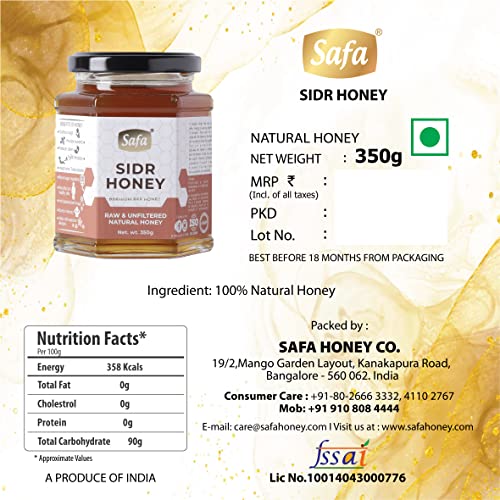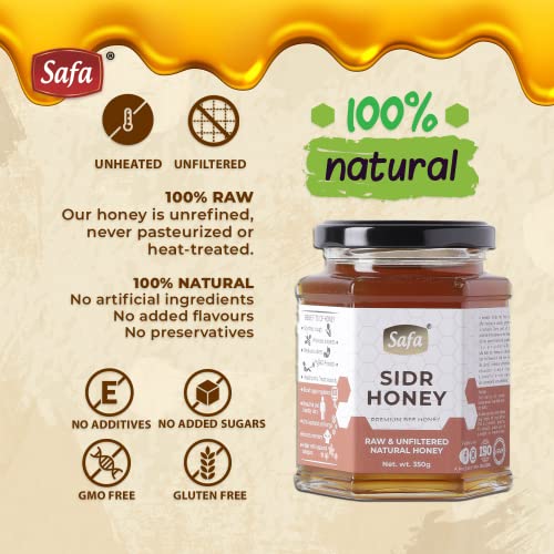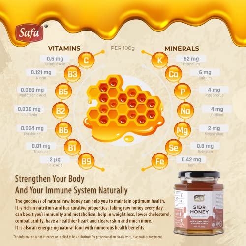 Sourced from the flowers of the revered auspicious Sidr tree Safa Organic Raw Sidr Honey is an immune-boosting anti-inflammatory and antioxidant-rich raw and unfiltered natural honey which is highly nutritious and possesses healing and restorative powers. Benefits Of Consuming Honey - Undoubtedly honey is established as a powerful natural immunostimulant. Among the proven benefits of Raw Sidr Honey: Cleanses and detoxifies the body: Raw Sidr Honey is rich in minerals enzymes and antioxidants that purifies the blood and detoxifies the body by cleansing and supporting liver function. Boosts Immunity: Regular consumption of Raw Sidr Honey boosts immunity and helps to strengthen the body's defenses against cold flu cough and other infections. Taking Raw Sidr honey everyday provides potent antioxidant support from free radical damage and oxidative stress. Helps in Weight-Loss: We all know that honey is a much more balanced choice over sugar. Rich in nutrients and enzymes consuming Raw Sidr Honey boosts metabolism and provides constant energy reducing unhealthy cravings and binging and consequently preventing obesity. It also helps in regulating blood sugar and maintaining healthy cholesterol levels. Improves Cardiovascular Health: Regular consumption of Raw Sidr Honey contributes to reducing risks of cardiovascular disease due to its strong anti-inflammatory and antioxidant properties. Improved Mood and Cognition: Raw Sidr honey with its nootropic properties improves mood calms the mind reduces symptoms of depression and anxiety enhances memory and cognitive functions making it an ideal brain tonic. Savour the buttery light golden dollops everyday by the spoonful on empty stomach in combination with other medicinal ingredients with your breakfast toast or in your cup of herbal tea to garner its miraculous health benefits. Information provided here is not intended to diagnose treat cure or prevent any disease or health condition.