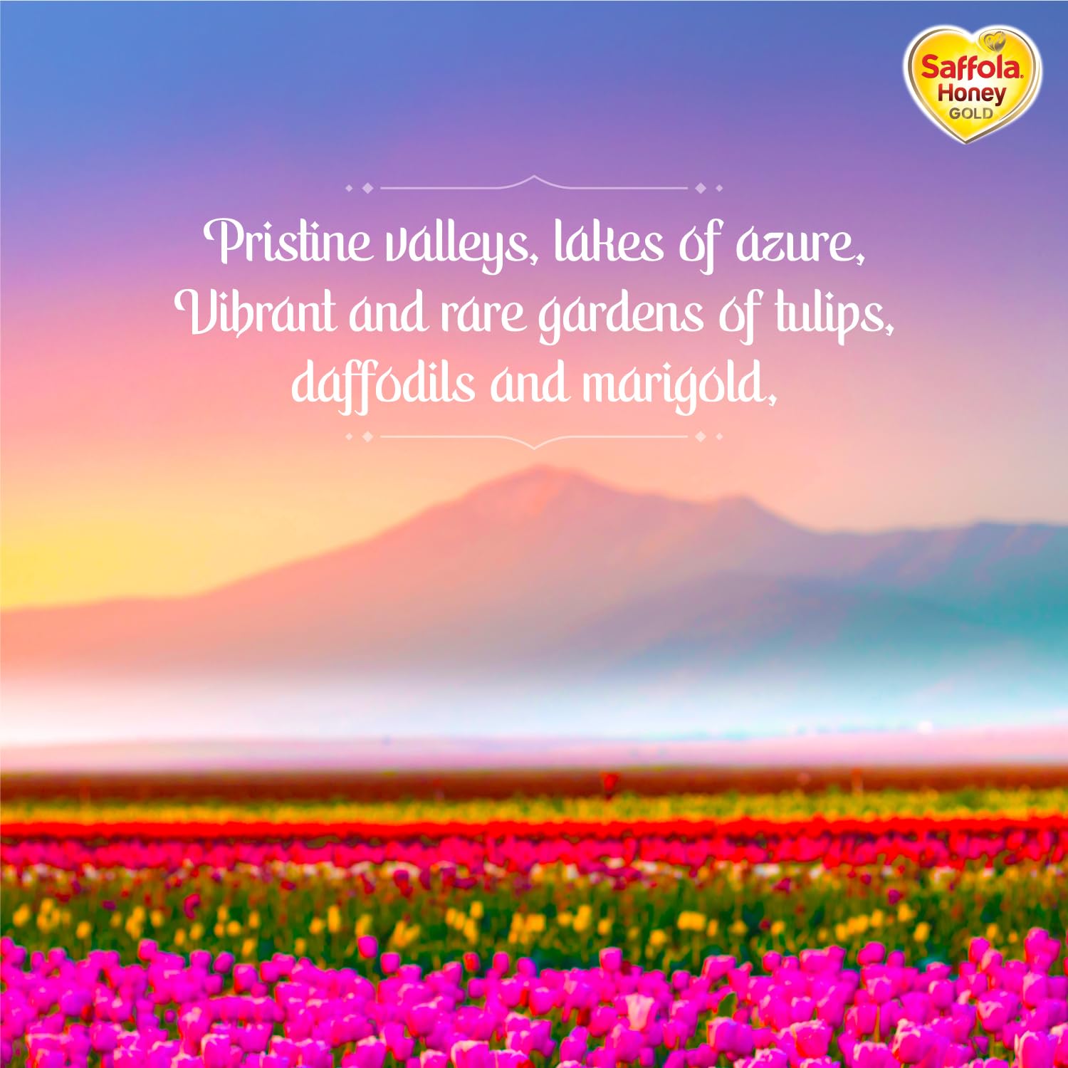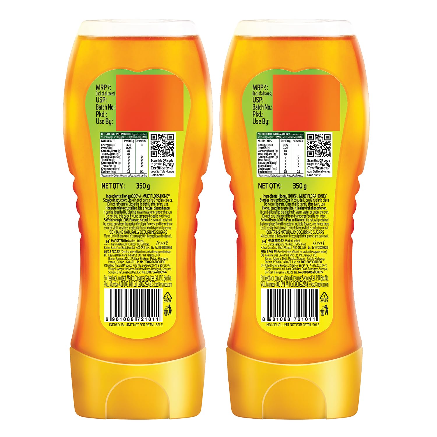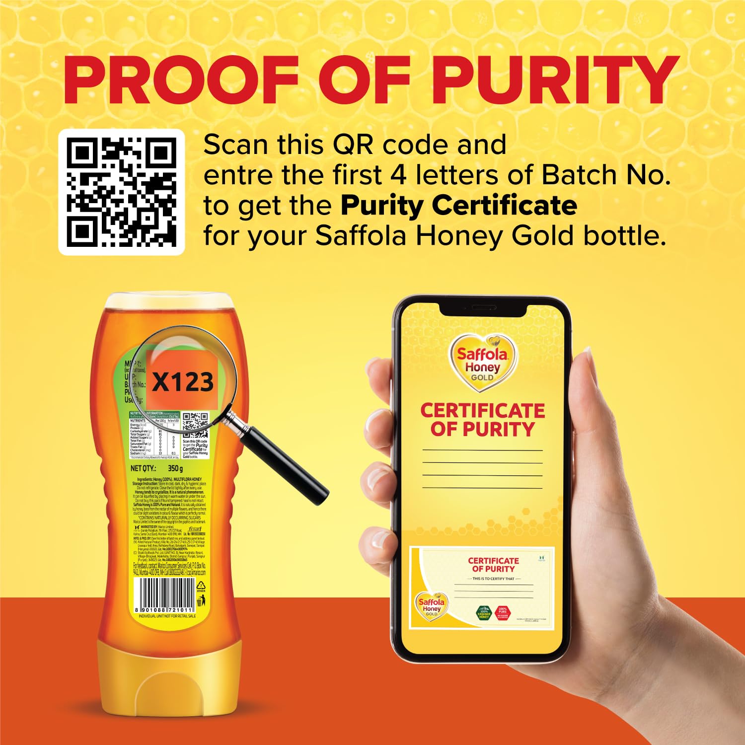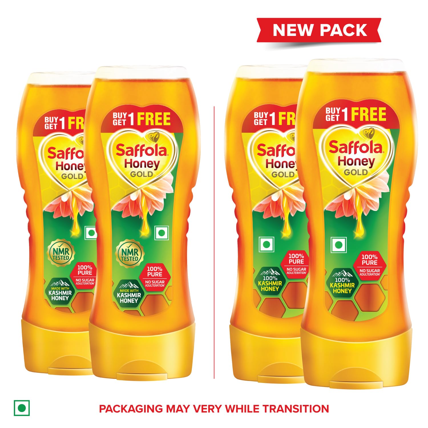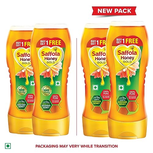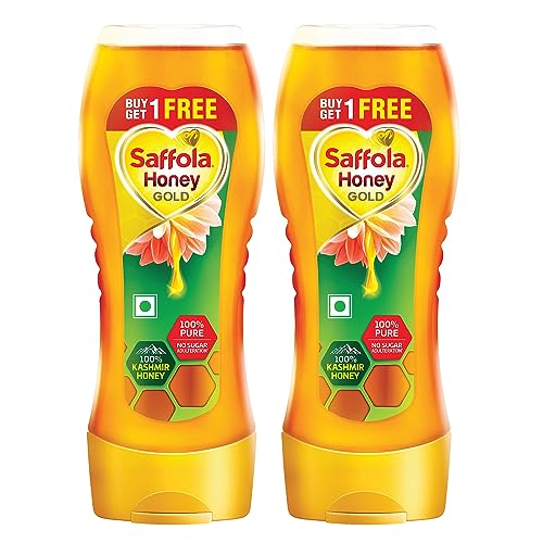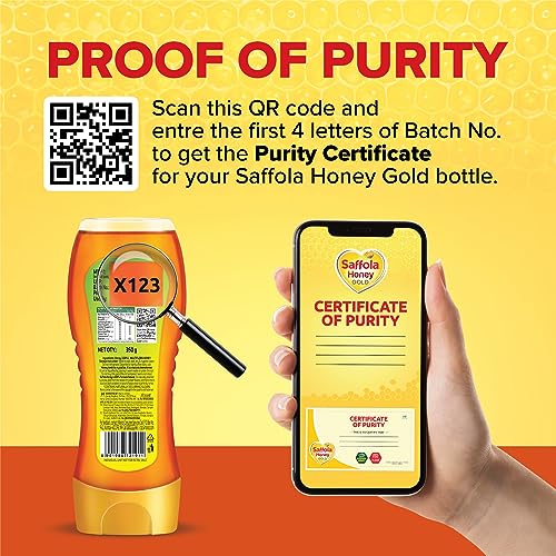 Honey is a natural food and comes with tons of uses and benefits and should be used in its pure form. Pure Honey is also a healthy alternative to sugar and is considered one of the most wonderful gifts that nature has ever gifted to mankind. However not all honey sold in the market are alike! Some are pure while others may be highly adulterated. As a consumer one needs to be watchful as adulterated honey comes with added glucose sugar syrup molasses corn syrup etc. Not every honey that reads pure necessarily stands true to its claim. A real sign of a pure honey is a product which is free from adulteration and which complies to all the FSSAI parameters. Saffola Honey Gold is natural honey in its purest form. It is multiflora Honey made using Kashmir Honey bringing the best quality to you. It is tested and approved after many rigorous quality checks. Each bottle of Saffola Pure Honey contains natural antioxidants has No Added Sugar and comes with a Purity certificate that is made available to its consumers.