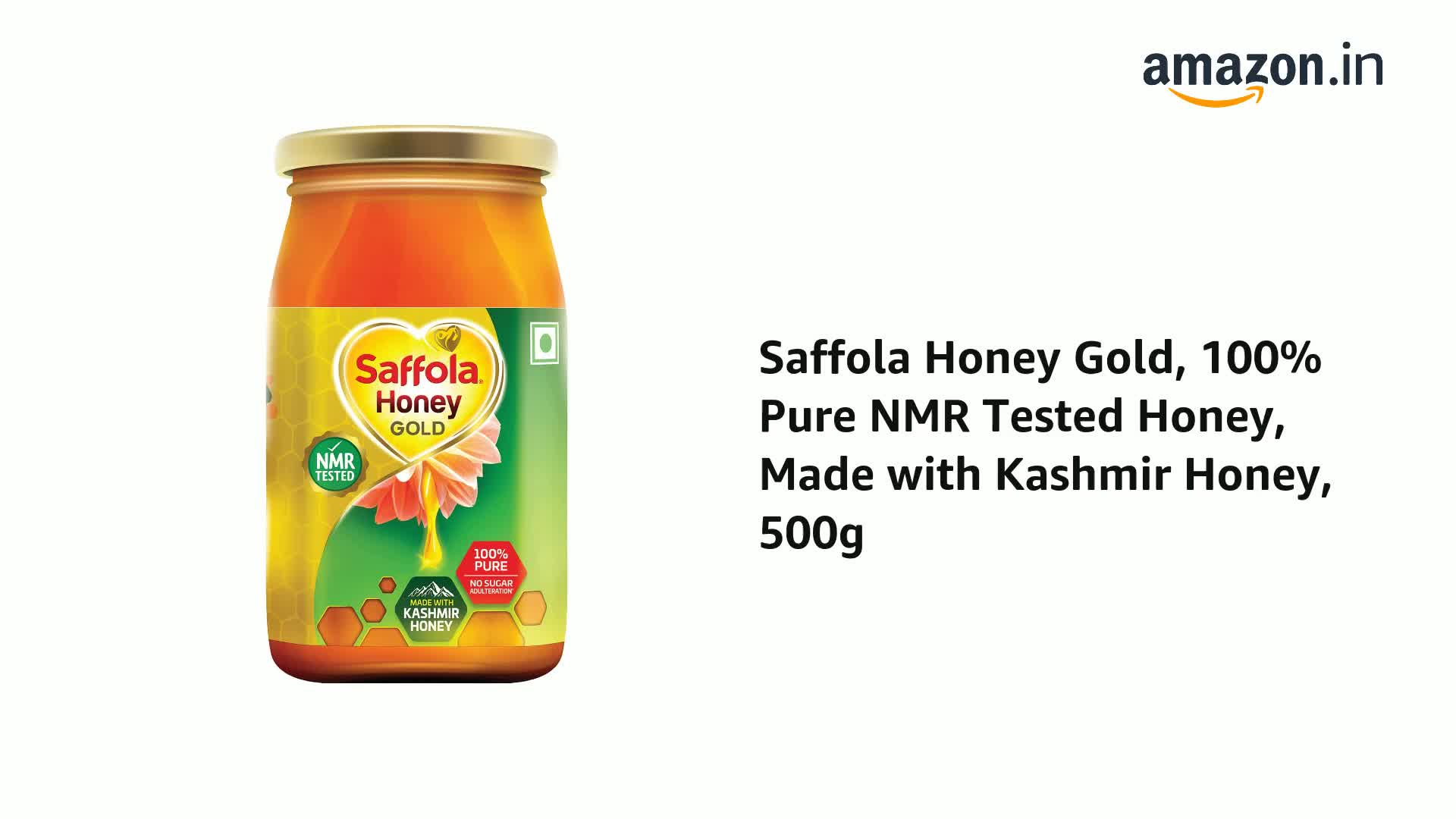 Honey is a natural food and comes with tons of uses and benefits and should be used in its pure form. Pure Honey is also a healthy alternative to sugar and is considered one of the most wonderful gifts that nature has ever gifted to mankind. However not all honey sold in the market are alike! Some are pure while others may be highly adulterated. As a consumer one needs to be watchful as adulterated honey comes with added glucose sugar syrup molasses corn syrup etc. Not every honey that reads pure necessarily stands true to its claim. A real sign of a pure honey is a product which is free from adulteration and which complies to all the FSSAI parameters. Saffola Honey Gold is natural honey in its purest form. It is multiflora Honey made using Kashmir Honey bringing the best quality to you. It is tested and approved after many rigorous quality checks. Each bottle of Saffola Pure Honey contains natural antioxidants has No Added Sugar and comes with a Purity certificate that is made available to its consumers.