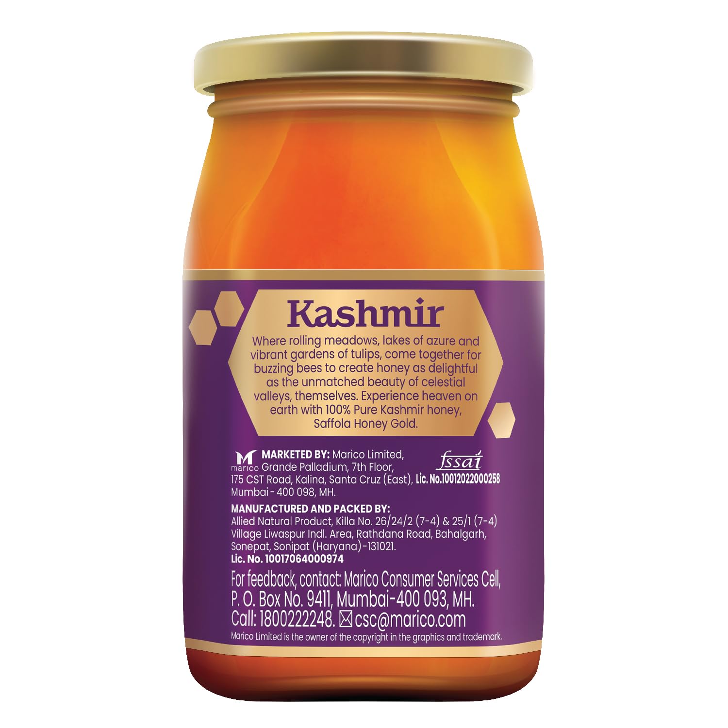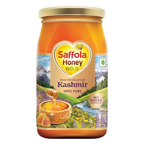 Honey is a natural food and comes with tons of uses and benefits and should be used in its pure form. Pure Honey is also a healthy alternative to sugar and is considered one of the most wonderful gifts that nature has ever gifted to mankind. However not all honey sold in the market are alike! Some are pure while others may be highly adulterated. As a consumer one needs to be watchful as adulterated honey comes with added glucose sugar syrup molasses corn syrup etc. Not every honey that reads pure necessarily stands true to its claim. A real sign of a pure honey is a product which is free from adulteration and which complies to all the FSSAI parameters. Saffola Honey Gold is natural honey in its purest form. It is multiflora Honey made using Kashmir Honey bringing the best quality to you. It is tested and approved after many rigorous quality checks. Each bottle of Saffola Pure Honey contains natural antioxidants has No Added Sugar and comes with a Purity certificate that is made available to its consumers.