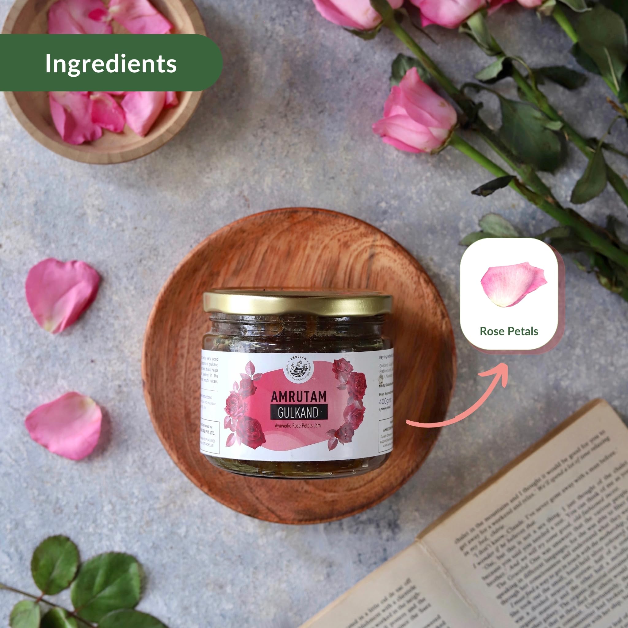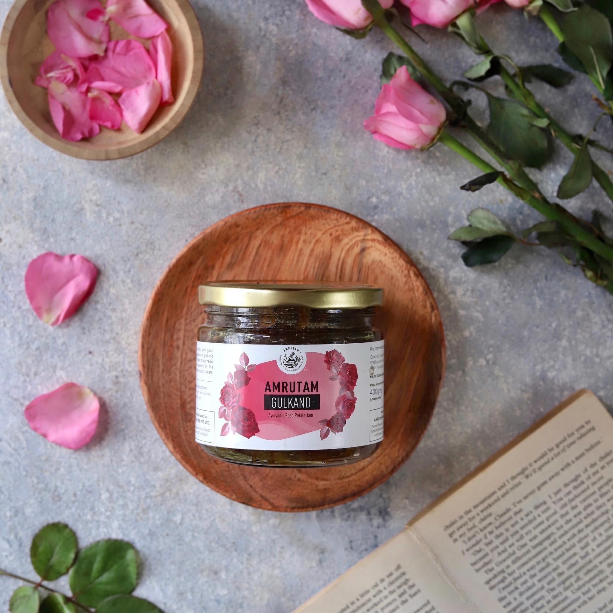 Experience the delightful and wellness-promoting Amrutam Gulkand a premium Ayurvedic rose petal jam carefully crafted with the finest ingredients to bring balance and harmony to your daily routine. Made from Rosa centifolia Gulab Phool pure Gulab Jal and an expertly selected blend of potent herbs this traditional recipe combines nature's best to offer a wide array of benefits. Amrutam Gulkand is known to support digestion promote skin health provide a refreshing cooling effect and act as a natural antioxidant to rejuvenate the body from within. This ancient Ayurvedic recipe is designed to bring calm and relaxation helping you embrace a sense of well-being and balance. Beyond its wellness properties Amrutam Gulkand offers a unique indulgent taste experience. The rich floral essence of roses blends perfectly with its subtle sweetness making it a delightful addition to a variety of meals. Spread it on bread add it to desserts or enjoy it on its ownâevery spoonful is an invitation to savor the luxurious essence of roses. Perfect for those seeking a natural Ayurvedic supplement that not only tastes delicious but also supports the body's vitality. Embrace the wisdom of Ayurveda with Amrutam Gulkand a rejuvenating elixir that enriches your wellness journey and helps keep you cool and refreshed especially during warmer months. Treat yourself to a jar of this exquisite Gulkand crafted with love and Ayurvedic knowledge to bring you the very best of nature's offerings. 400 grams.