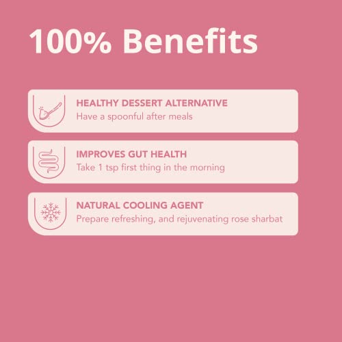 • HOW TO CONSUME: Morning : Take a scoop first thing in the morning to beat bloating fatigue and lethargy. After-meal : Have a spoonful after meto help relieve acidity and stomach heat. Refreshing drink: Prepare a refreshing rose sharbat which acts as a nat