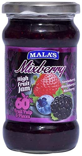 The Jam made in the hilly countryside where the berries are grown in our backyard to be processed into a fresh wonderful gourmet delights. Mala's High Fruit Jams are premium fruit spreads with 60% Fruit content which is made from fruit juices pulps & pieces for real fresh sweetness. The natural sweetness of fruits adds to the taste which is much fresher and more delicious than the heavy taste of sugar. A hearty delightful Fruit Spread for fruit lovers