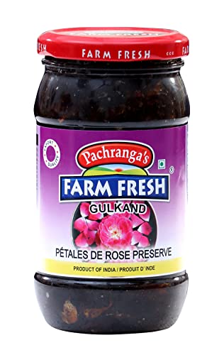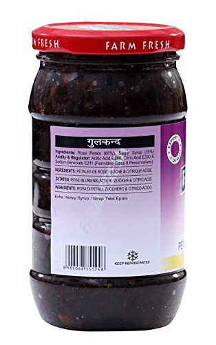 Popular Indian Gulkand with finest quality Rose Petals in a authentic blend of traditional recipe. Gulkand has cooling properties thus it is beneficial in alleviating all heat related problems like tiredness lethargy itching aches and pains. It also helps in reducing burning sensations in the soles and palms.Gulkand is a powerful antioxidant and a very good rejuvenator.Consuming 1 - 2 teaspoons of gulkand helps to reduce acidity and stomach heat. It also helps in treating ulcers and prevents swelling in the intestine.Gulkand helps to treat mouth ulcers strengthens teeth and gums.It can be used to treat dysmenorrhoea and is effective in relieving menstrual pain. It is also helpful in treating excessive white discharge problem.A very good digestive tonic - helps to improve appetite improves digestion and corrects digestive