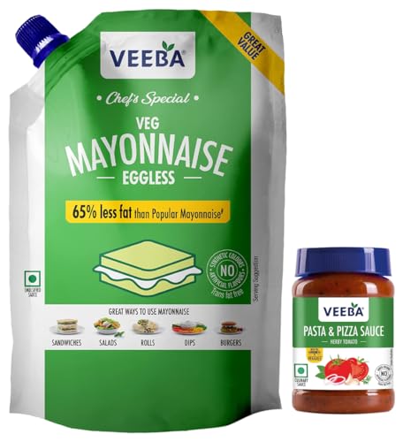 Veeba Eggless Mayonnaise (875g) I Veg Mayonnaise I 100% Vegetarian Mayo I Extra Creamy and Delicious I Rich and thick texture I Dip Spread and Dunk100 percent veg great for sandwiches and rolls.veeba pasta pizza sauce 280gAll our sauces and dressings have exceptionally low fat content at the same time retaining that perfect balance of taste and flavour.You can now make your favourite sandwich salad or snack in the comfort of your home.