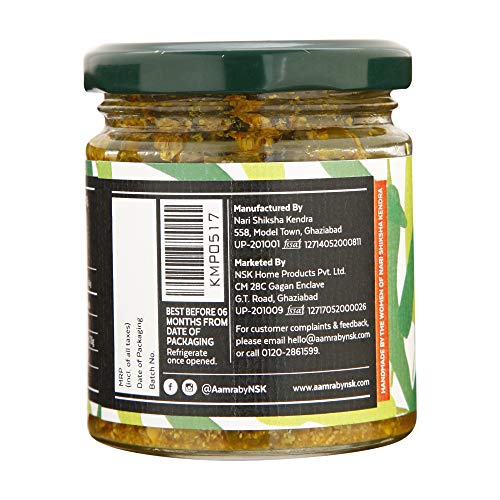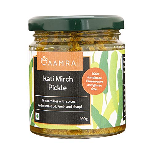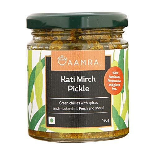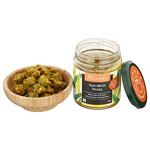 Fresh green chilies tossed with mustard oil and spices. Sharp and classic! Aamra's pickles follow traditional recipes and time-honoured techniques. Preserved naturally in special spice blends our pickles are aged in barnis (earthen jars) that are stored in cool dark rooms to draw out the natural flavours. Pickles that will add a punch to every meal Aamra's pickles are easy to store and convenient to use. Serve with all Indian meals or as a refreshing side with grilled meat dishes.Ideal with Indian meals rice and lentils and parathas for the perfect breakfast! Aamra's products are 100% handmade by the women of Nari Shiksha Kendra. No artificial preservatives Gluten Free. Preserved traditionally in earthen jars or 'barnis'.
