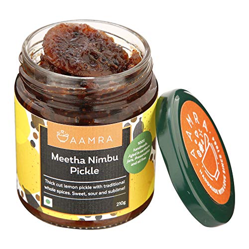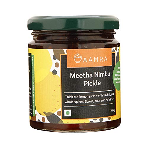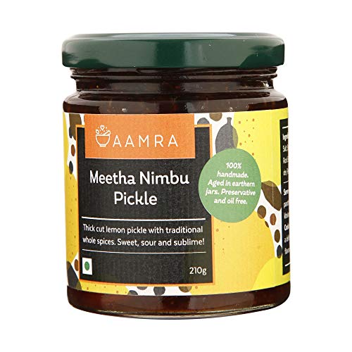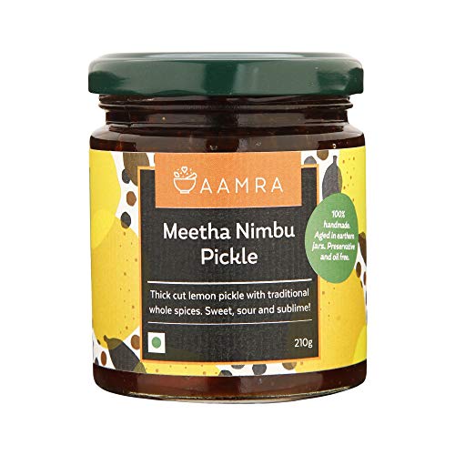 Aamra traditional homemade meetha nimbu pickle (210 g). sweet sour & mature | thick cut lemon pickle with traditional whole spices. Aged for two years in earthen jars. Oil free no artificial preservatives handmade serve with daal-chaawal mathri and khakra or add to your dal for a lemony flavour.