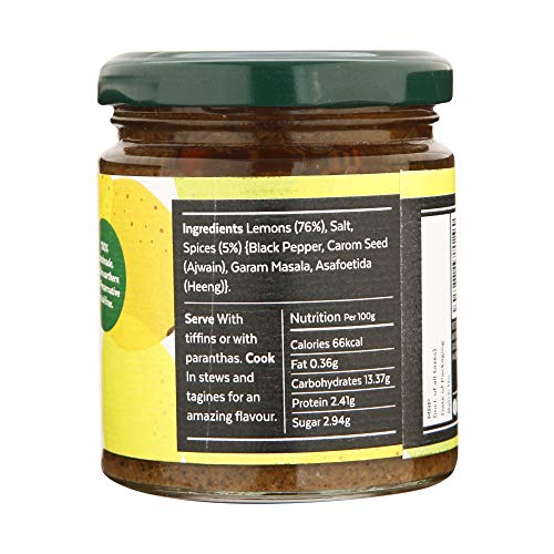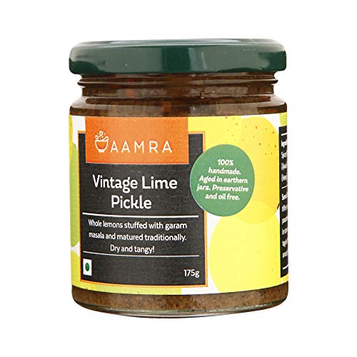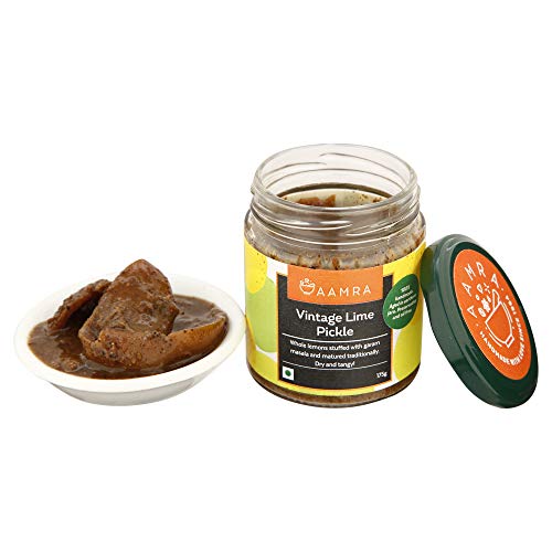 Aamra traditional vintage lime pickle 175gm (black lemon pickle). dry & tangy | whole lemons stuffed with garam masala ajwain (carom seeds) and black pepper and matured traditionally in earthen jars. Oil free preserved in barnis (earthen jars) no artificial preservatives handmade serve with all Indian meals add to stews & tagines - great for tiffin or as a post-meal digestive!.