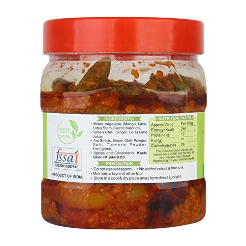 • Mixed INGREDIENTS: Mixed Vegetable (Mango Lime Lotus Stem Carrot Karonda Green Chilli Ginger Dela) Lime Juice Ani Seeds Green Chilli Powder Salt Turmeric Powder Fenugreek Spices & condiments Kachi Ghani Mustard Oil.