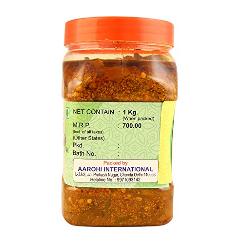 Our special homemade pickles are pure natural traditional style pickle. Every single ingredients is carefully selected and manually checked for quality before being thoroughly washed dried and hand cut into slices. The fresh spices we pick are also carefully measured for taste and consistency. This is one of the most popular and traditional pickles found in almost every Indian home.Specialities:The naturally produced pickle ingredients are mixed with secret and years old recipe.Spices are carefully selected and of best-quality are used in this pickle to make them last longer and keep you healthy.Every bottle is packed carefully in hygienic conditions.Bottles are sealed to keep the pickle fresh and retain its flavor and aroma for long time.A wonderful way to make every meal richer healthier and tastier.The natural taste and flavour of the pickle stimulates and pleases your taste buds.No added chemicals preservatives and flavours.We offer our customers a wide range of 100% pure natural and organic products at their door steps. Our production department checks and ensures that the products are packed in a hygienic and strictly controlled environment.