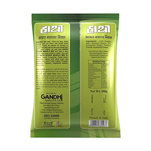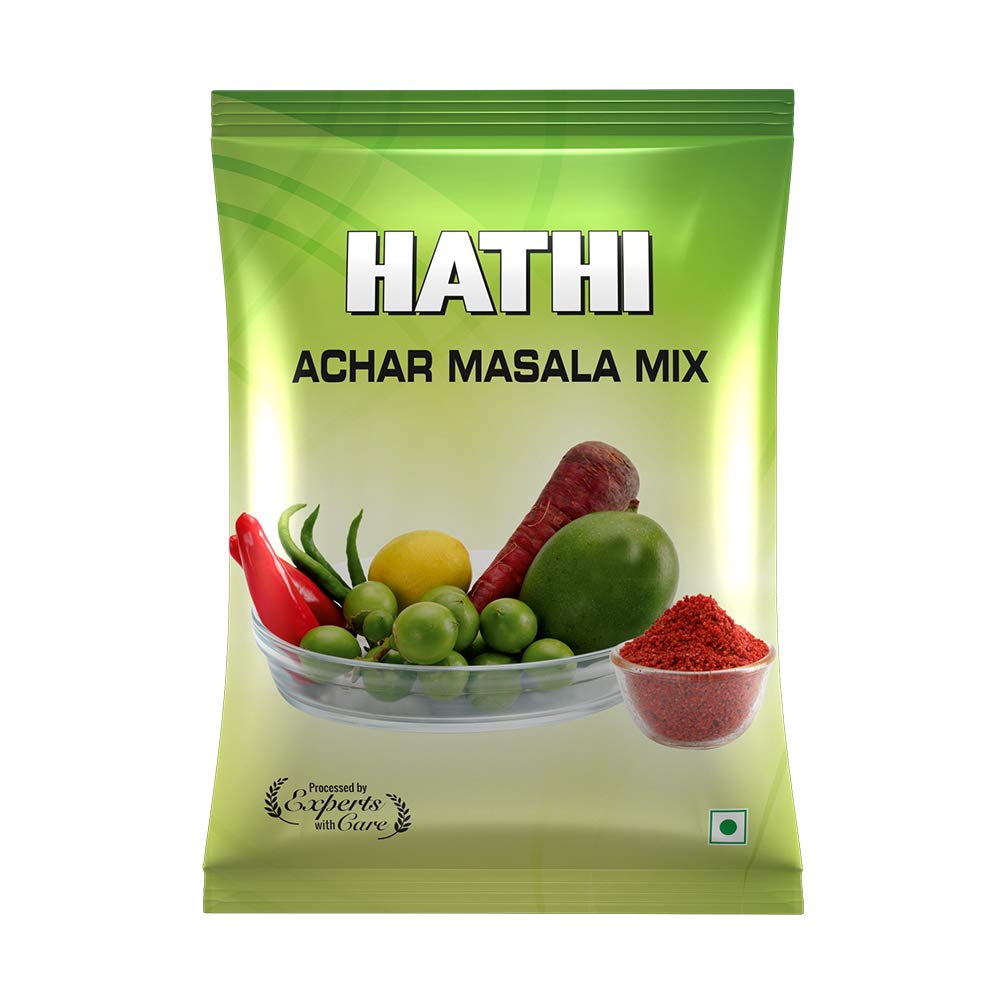 Hathi presents this achar masala which is made of chili powder iodized salt mustard seeds edible oil fenugreek seeds turmeric powder and asafetida powder and best before 8 months from the manufacturing date.