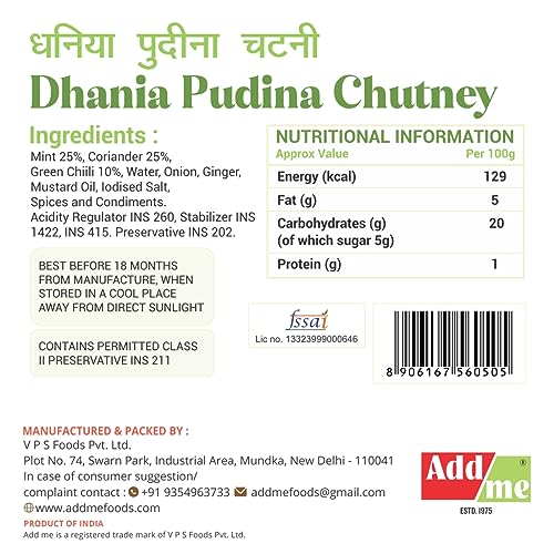 Mint (25%), Coriander (25%), Green Chilli (10%), Water, Onion, Ginger, Mustard Oil, Iodised Salt, Spices & Condiments, Acidity Regulators INS 260, Stabilizers INS 1422, INS 415, Preservative - INS 202